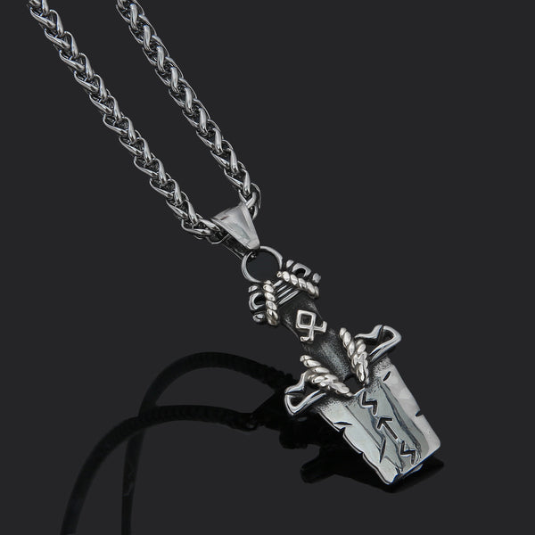 Viking Odin Sword Necklace with Norse Runes Totem Pendant in Titanium Steel