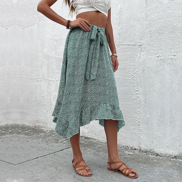 Summer Floral Print Belt Irregular Pleated Half-length Dress for Women