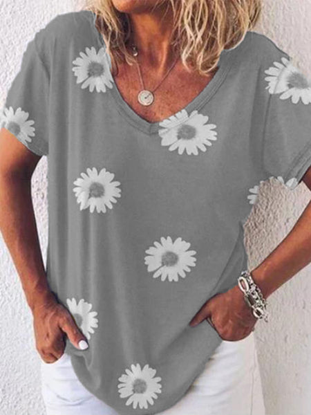 Women's Summer Loose V-Neck Floral Print Short Sleeve T-Shirt
