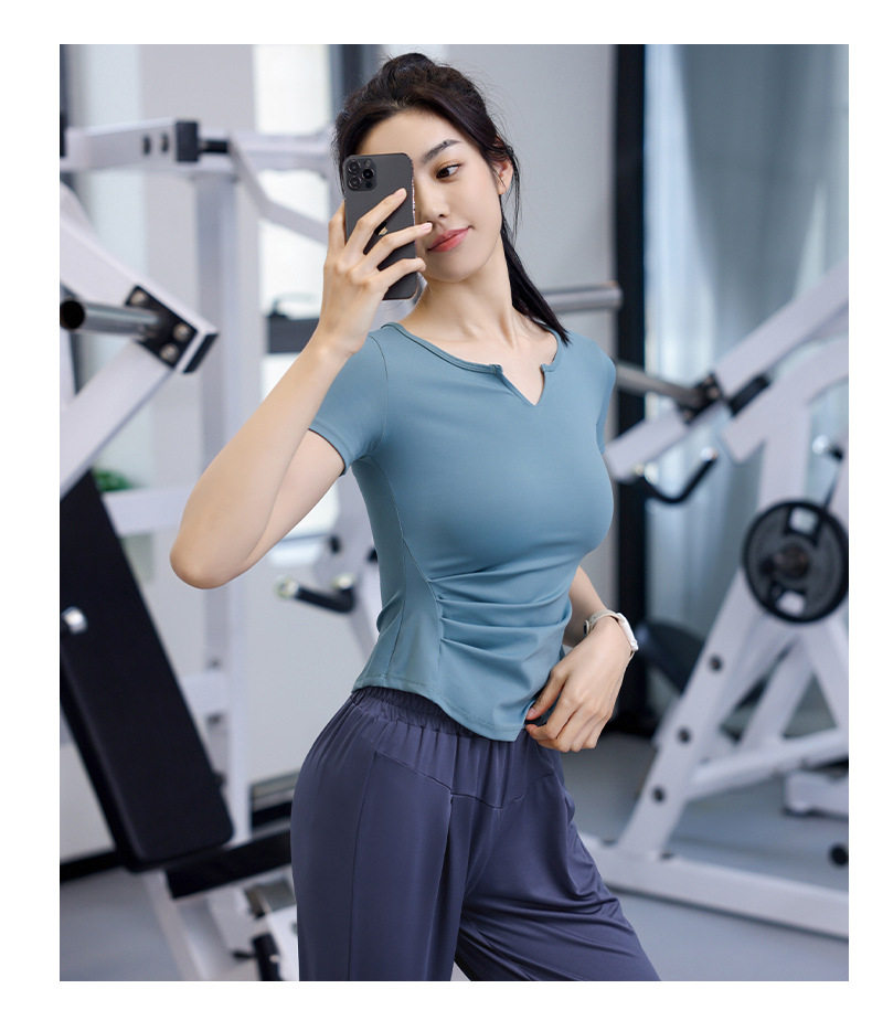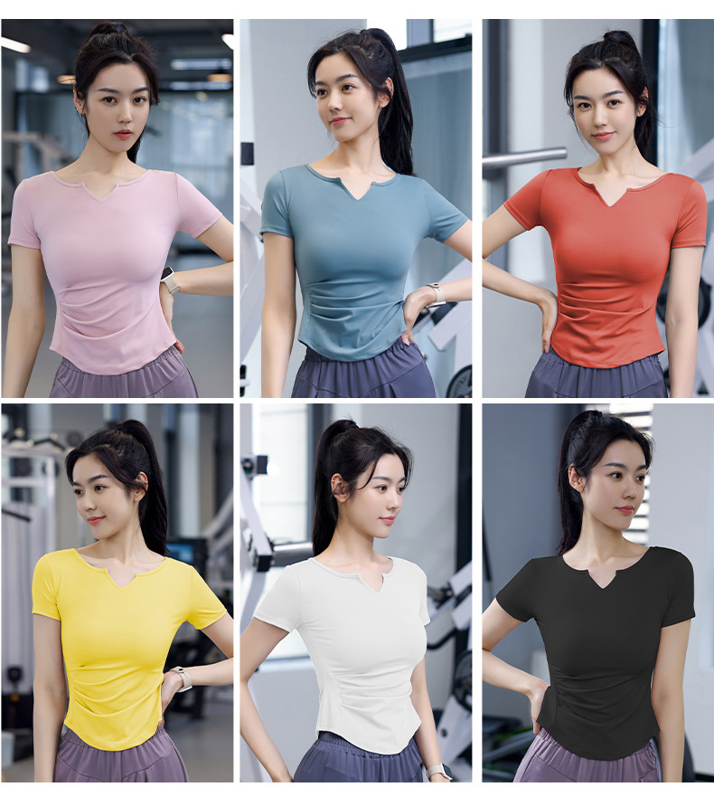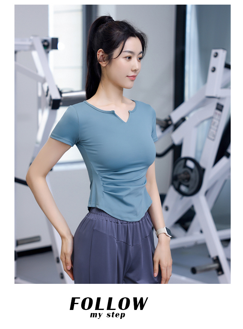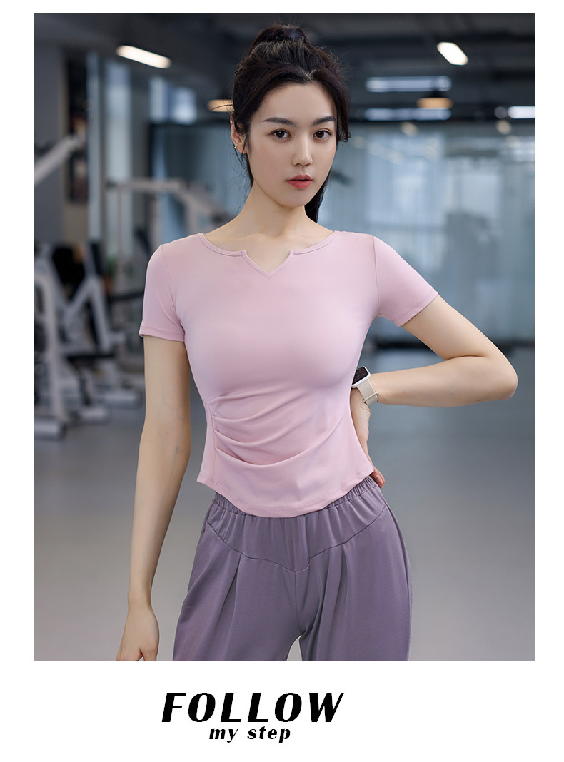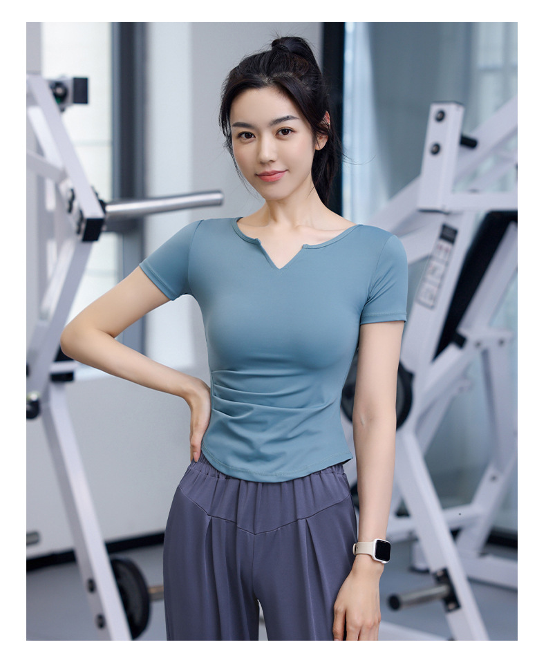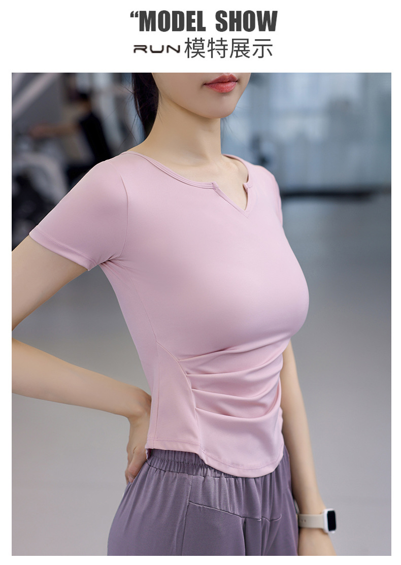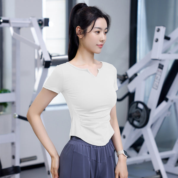 Women's Quick-Dry Short Sleeve T-Shirt with V-Neck and Tucks for Running and Exercise