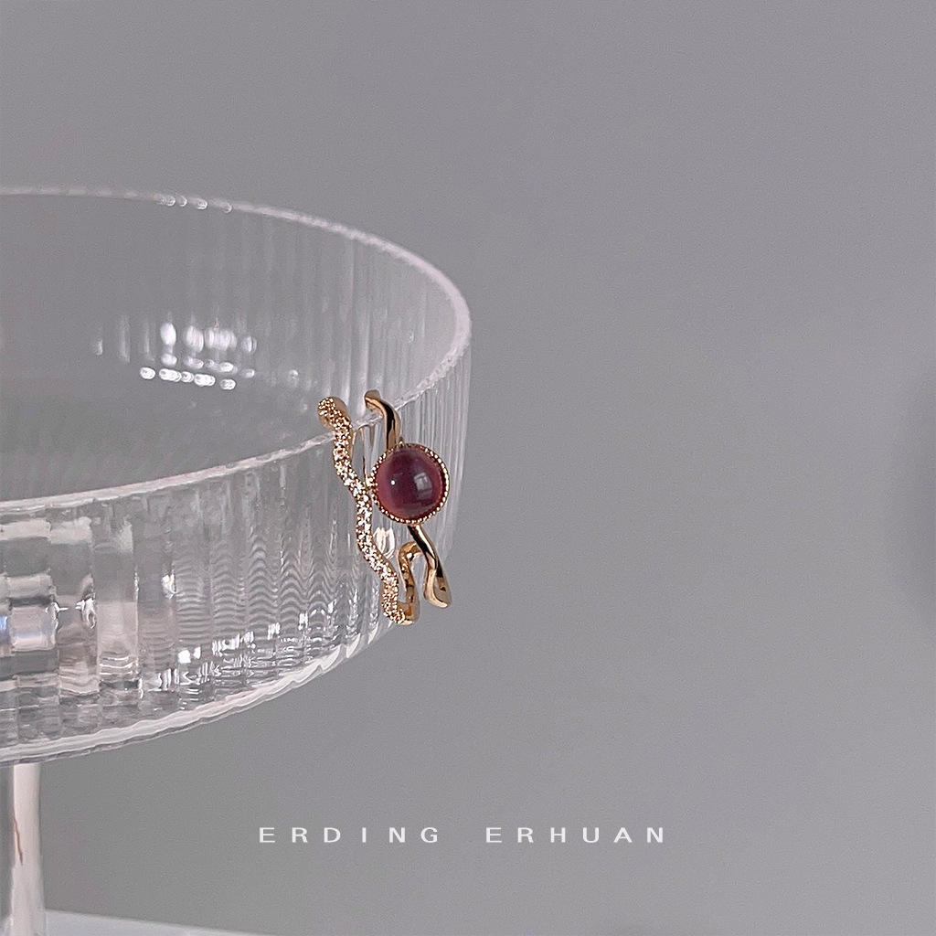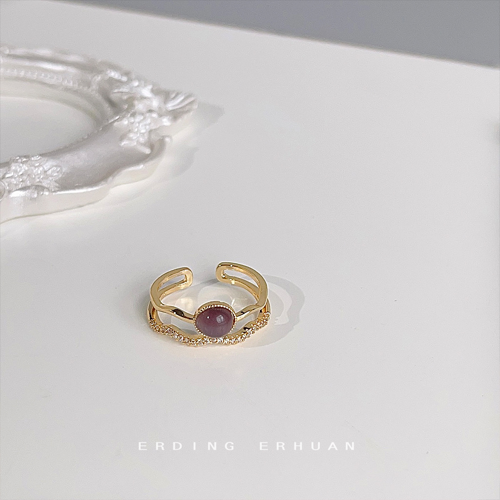14K Adjustable Women's Ring with Micro-Inlaid Zircon and Glass Cat's Eye