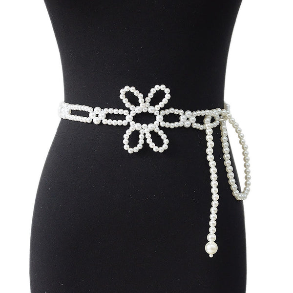 Women's Floral Elastic Waist Belt with Pearl Decoration for Summer Wear