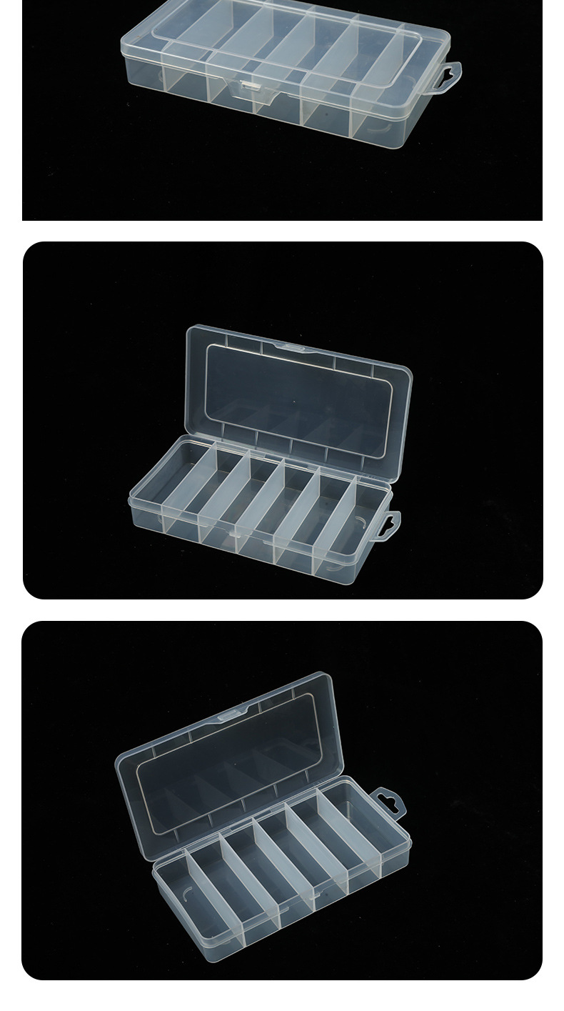 - ["6 Grid Transparent Storage Box with Handle and Grid Divider for Easy Use","Made of PP/PS Material with 80%-99% New Material Ratio","Size: 20.2*10.5*3.4cm, Weight: 107.1g","Suitable for Wide Range of Scenes, Such as Home, Office, Car, etc.","Customizable with Logo Printing"]