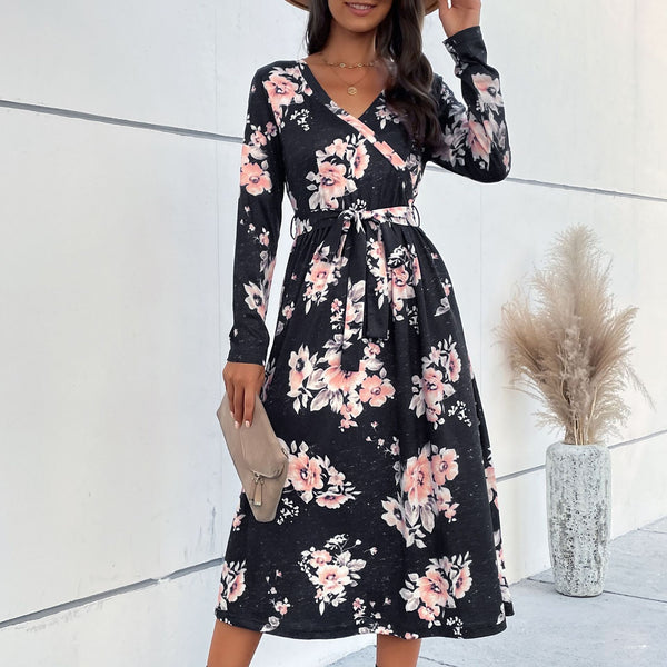 Women's Autumn and Winter New Style V-Neck Long Sleeve Floral Print Dress Mid-Length Dress
