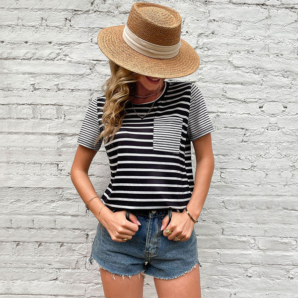 {"Cut":"Loose","Style":"Casual Style","Pattern":"Stripes","Style Type":"Japanese and Korean Casual","Collar Type":"Round Collar","Fabric Name":"Polyester Fibre","Sleeve Type":"Regular Sleeve","Craftsmanship":"Pasting/Piecing","Sleeve Length":"Short Sleeve","Fashion Element":"Color Block","Cross-border Style Type":"Comfortable Casual","Main Fabric Component 2":"Spandex","Main Fabric Composition":"Polyester (Polyester)","Main Fabric Composition Content":"95% and above"}