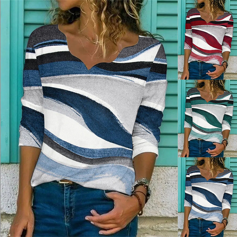 Women's Geometric Printed Long Sleeve T-Shirt with 95% Polyester and V-Neck Collar