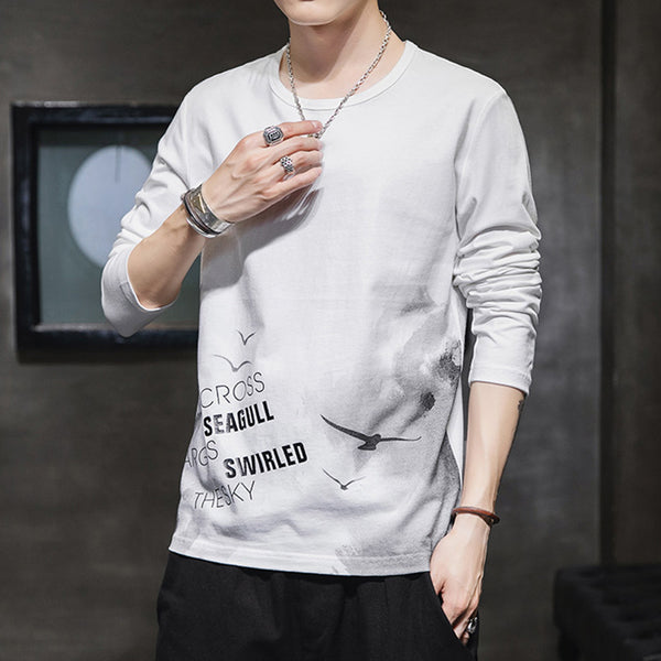 Men's Korean Style Round Neck T-Shirt with Floral Pattern for Autumn