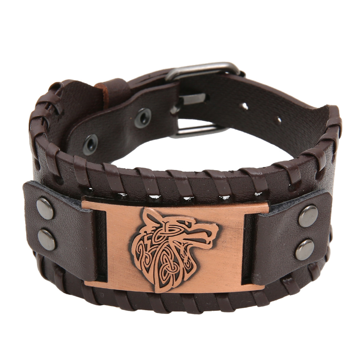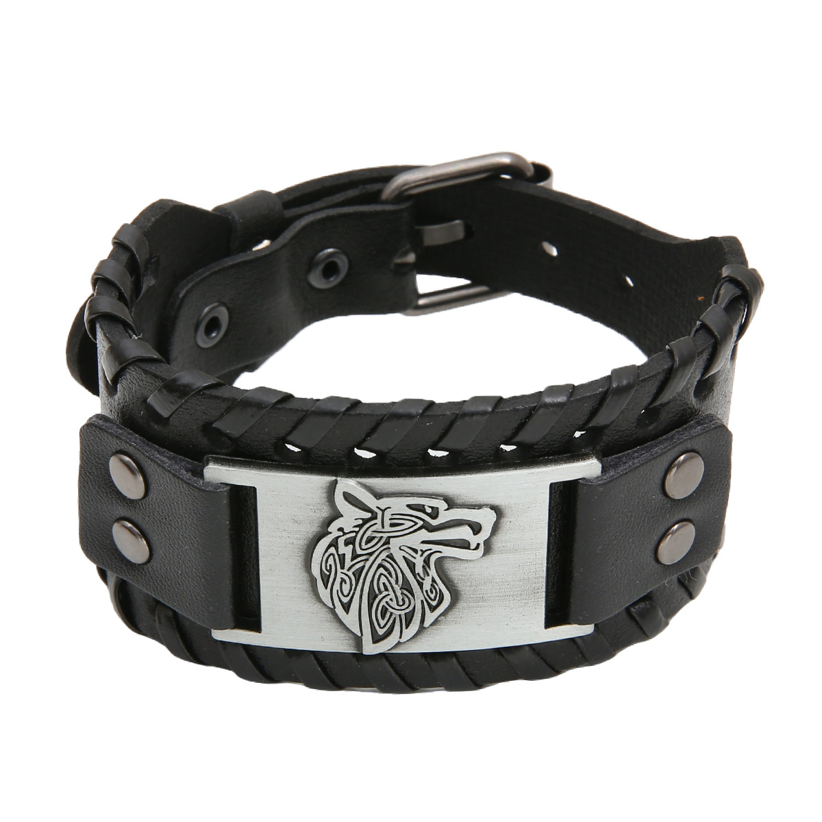 - ["Made of high quality alloy and leather material","Unique wolf head design makes it more fashionable","Handmade craftsmanship, exquisite and delicate","Wide leather bracelet, comfortable to wear","Suitable for travel memorial occasions"]