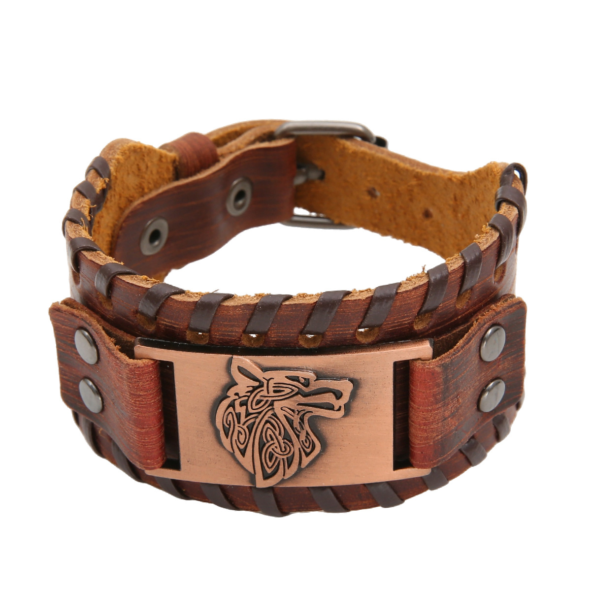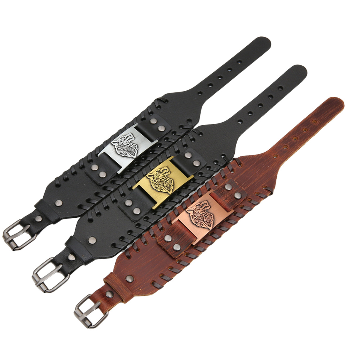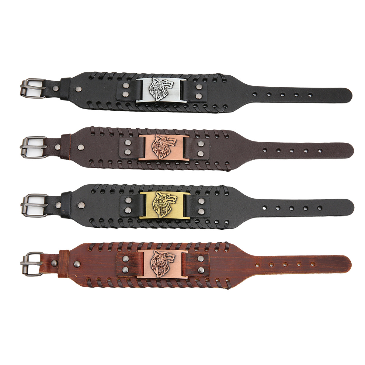 Men's Alloy Wolf Head Wide Leather Bracelet New Weave Bracelet Leather Ornament