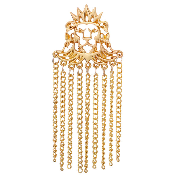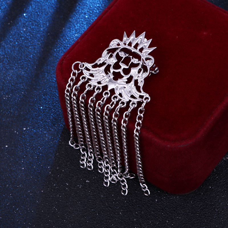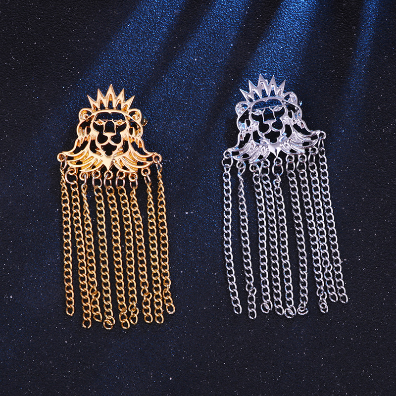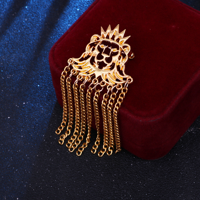 - ["Unique African Lion Brooch with Tassel Chain Crown Flower","Perfect for Men's Coat Accessories","Personalized Lion Badge for Women","Made of High Quality Alloy","Suitable for Both Men and Women"]