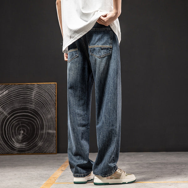 Men's College-Style Water-Washed Retro Jeans with High Elasticity and Straight Leg Design