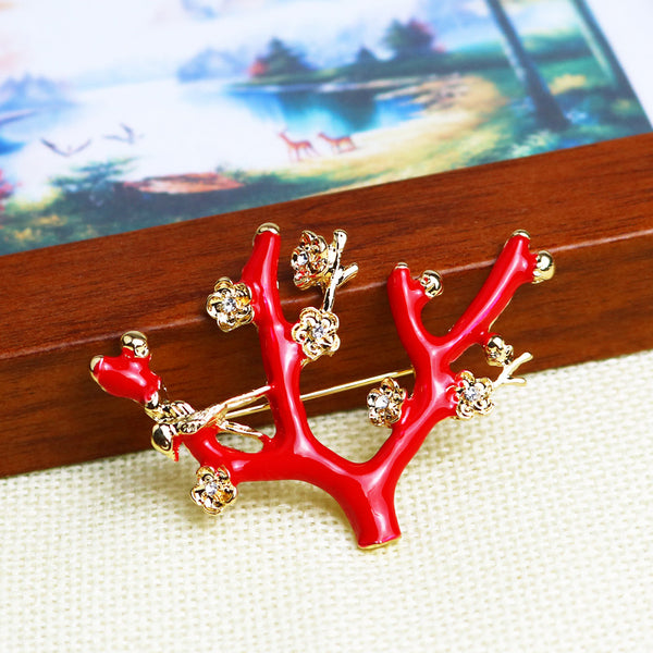 Vintage Chinese Style Red Coral Tree Flower Brooch for Women Noble Classic Court Style Small Bird Plum Blossom Tree Brooch