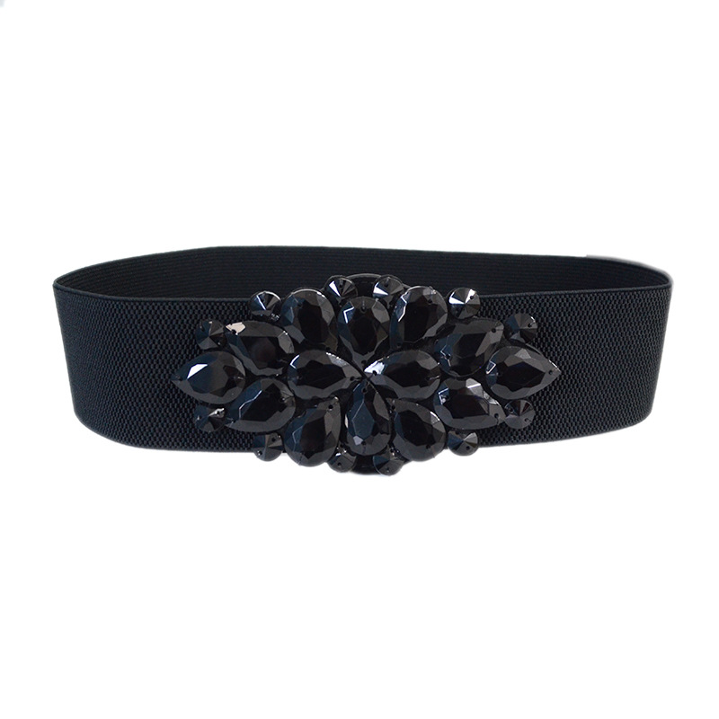 - ["Made with high quality faux leather material","Features a waist-defining elastic belt","Decorated with water drill","Hundred-piece style","Simple buckle closure"]