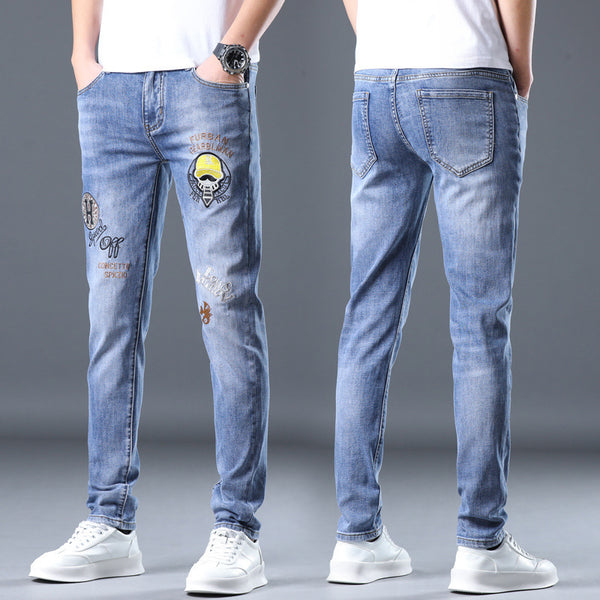 Men's Korean Style Stretch Jeans with Embroidery, Slim Fit Jeans for Autumn/Fall Season (18-24 Years Old)