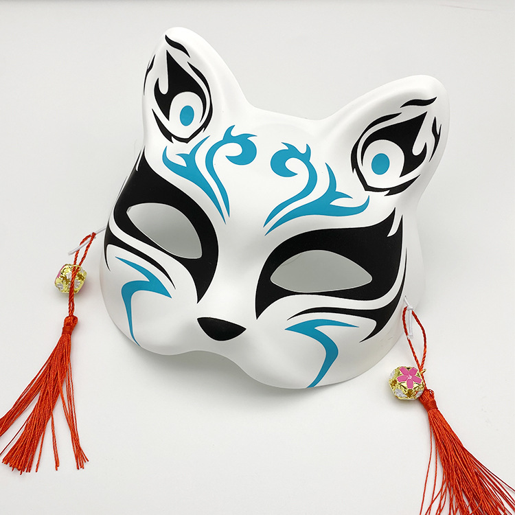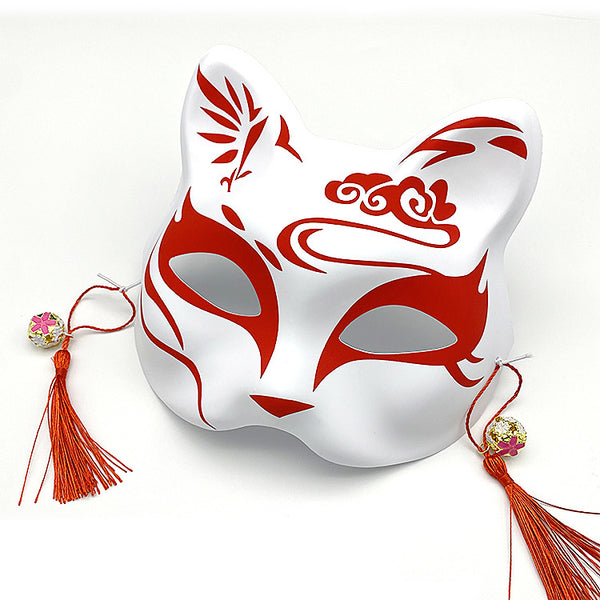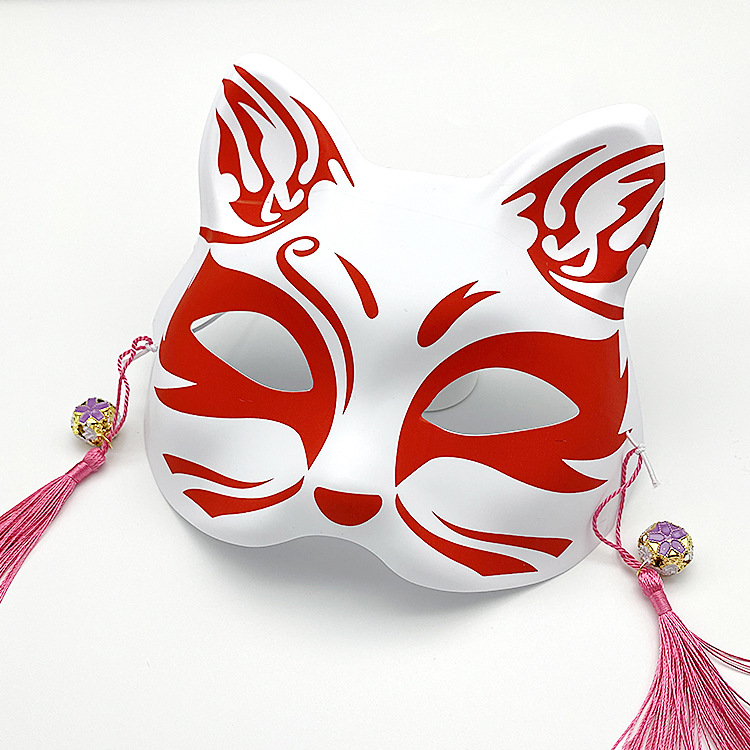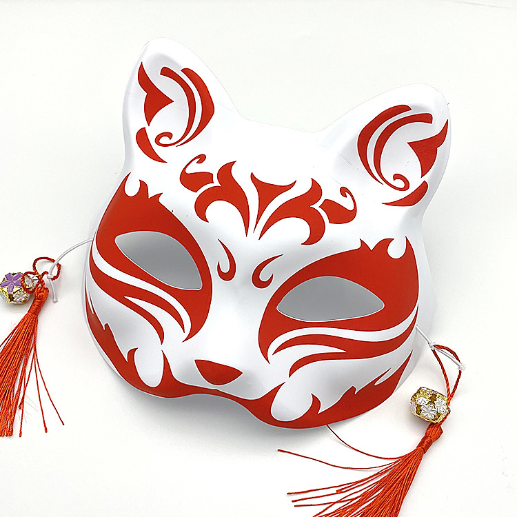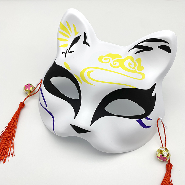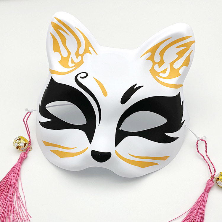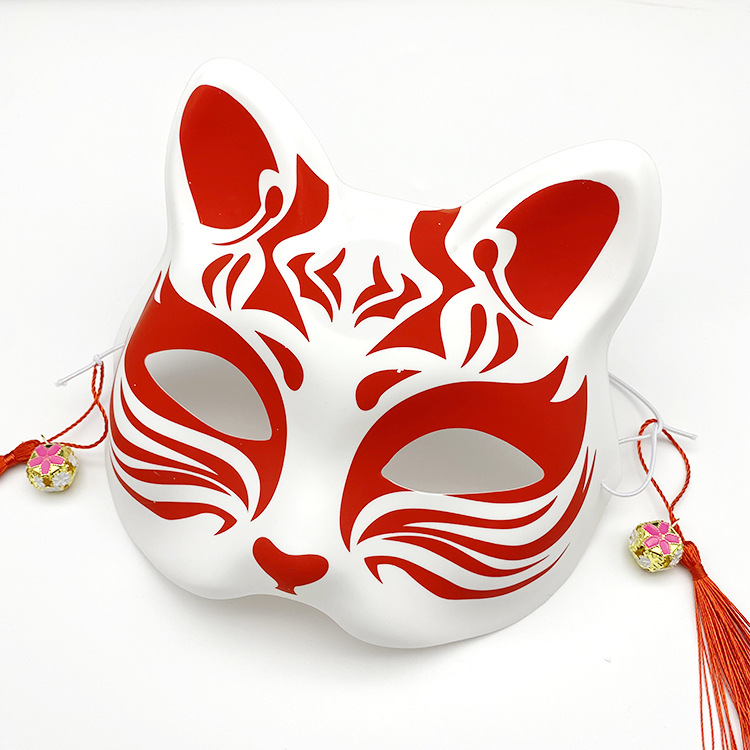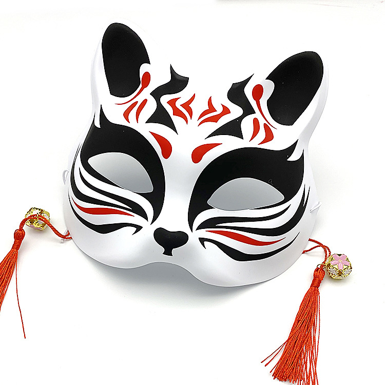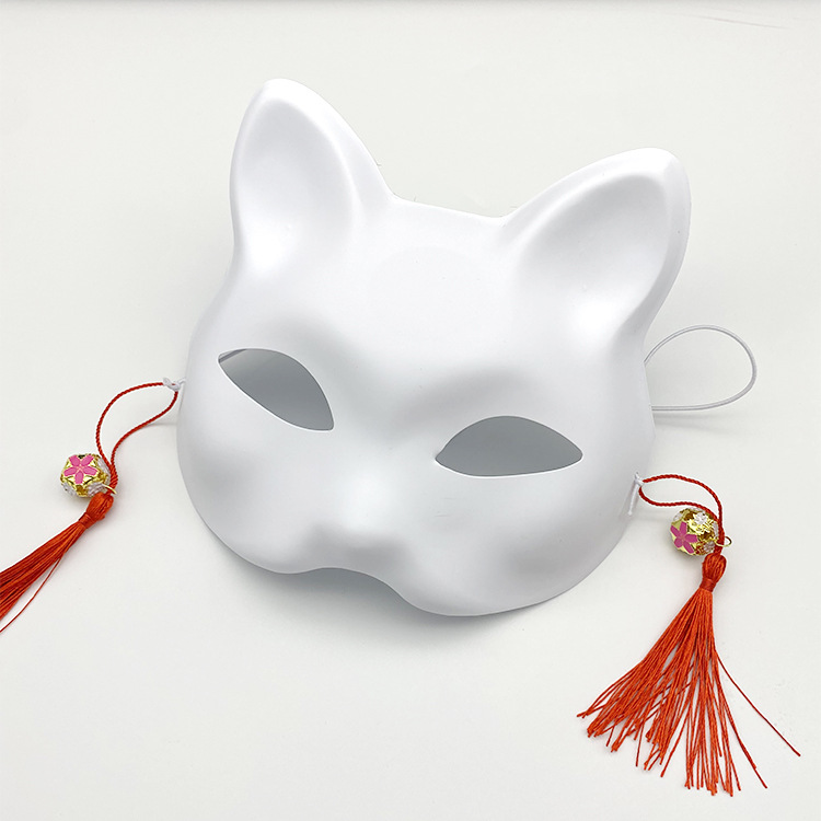 - ["Handcrafted with high-quality cotton material","Perfect for Halloween and other costume parties","Unique design with a bell and cat shape","Suitable for adults with half face","White ancient costume style"]