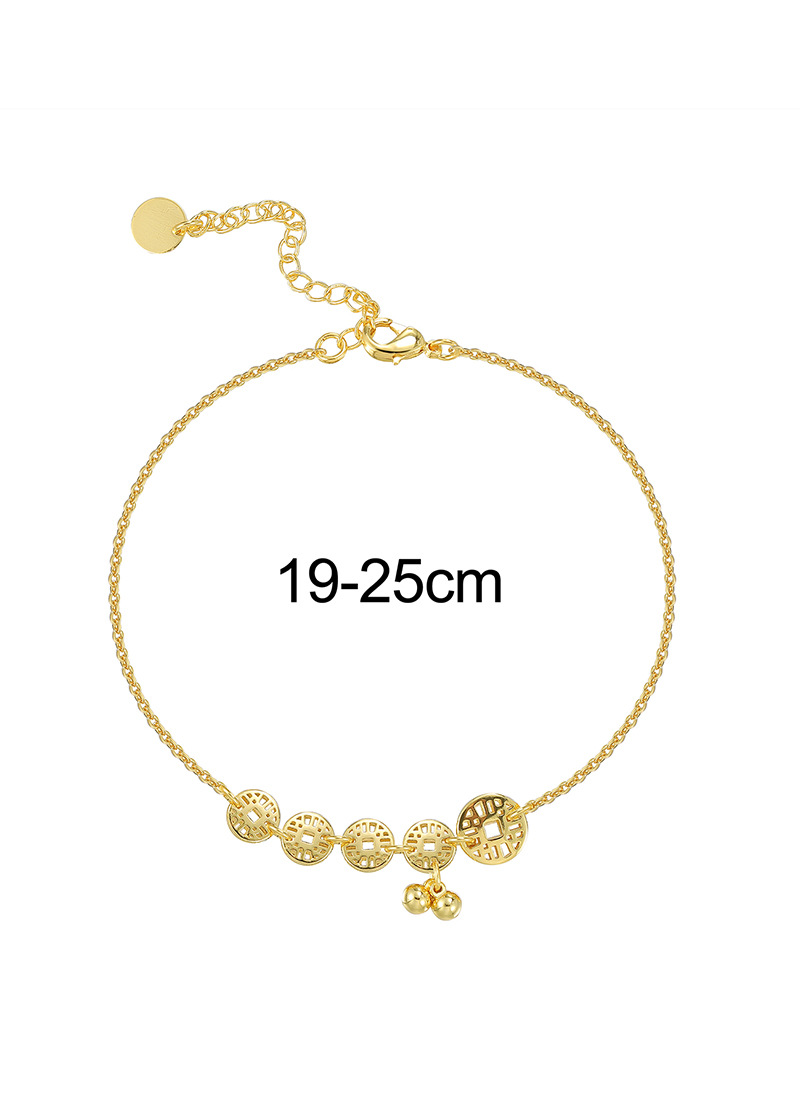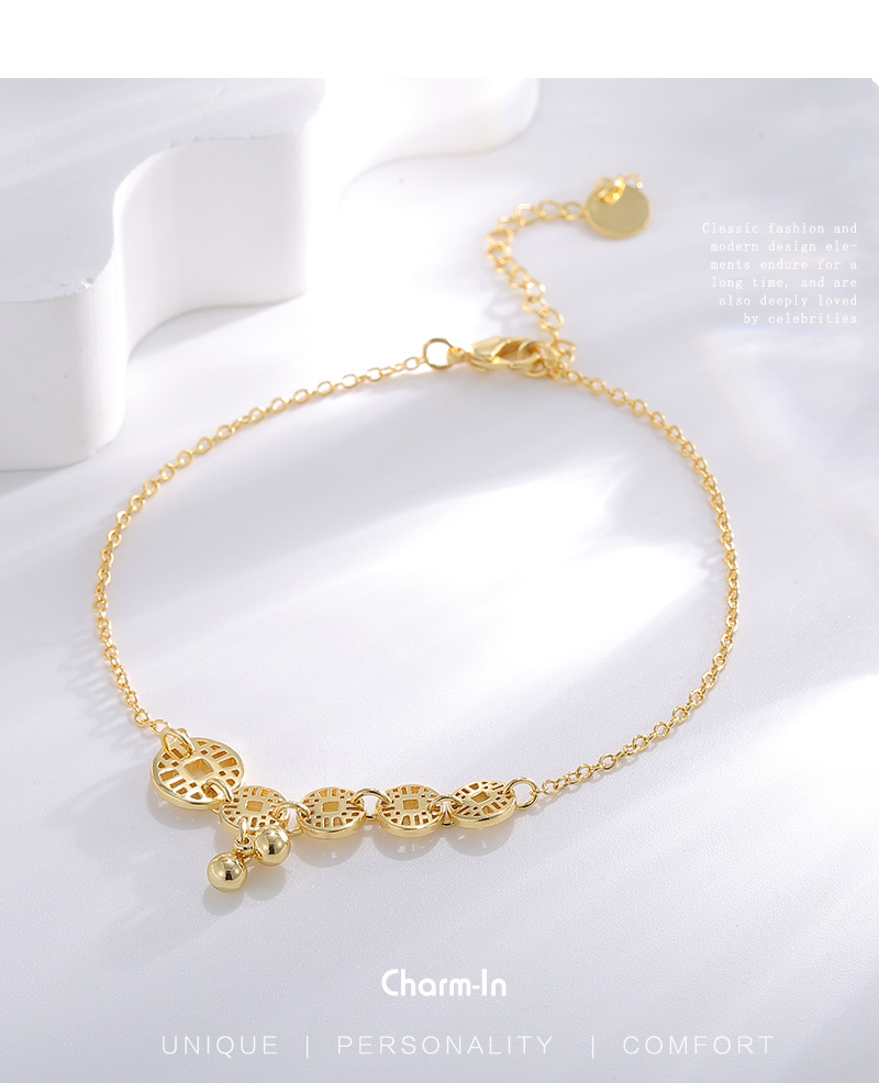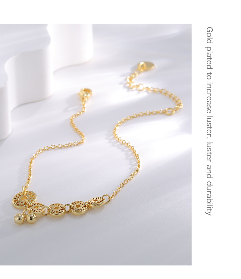 - ["18K Gold Hollow Coin Anklet for Women","European and American Style Design","High-end Foot Jewelry for Travel Souvenir","Hexagon Model with Independent Package","Made of Copper with 18K Gold Purity"]