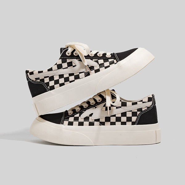 - ["Made of breathable canvas material","Stylish Chessboard pattern","Low Heel for comfortable wearing","Lace-up style for easy wearing","Suitable for all ages"]