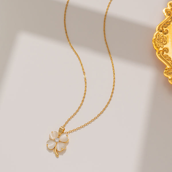 - ["Made with high-quality steel and gold plating","Simple and elegant design","Heart-shaped cat eye stone clover pendant","Circle chain for a secure fit","Production number 826"]