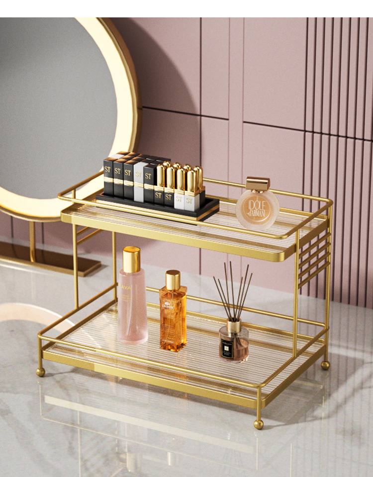 - ["Made of high-quality steel for durability","Light luxury style to match your bathroom decor","2 layers and 4 pieces for ample storage","Acrylic box included for extra storage","Tabletop style for easy installation"]