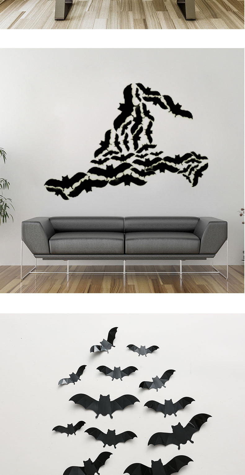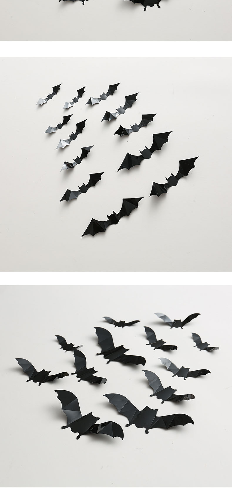 - ["Made of high quality PET material, durable and waterproof","3D black bat wall sticker, perfect for Halloween decoration","Easy to stick and remove, no residue left","Reusable, can be used for multiple times","Ideal for Halloween party scene decoration"]