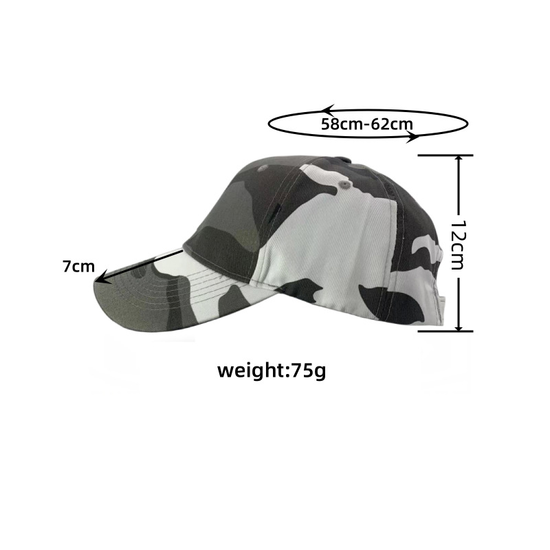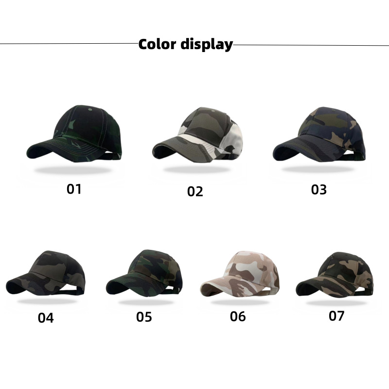 - ["Fashionable camouflage baseball cap for men and women","81%-95% cotton material","Spring season design","Round cap and wide brim","Windproof, breathable and sun protection"]