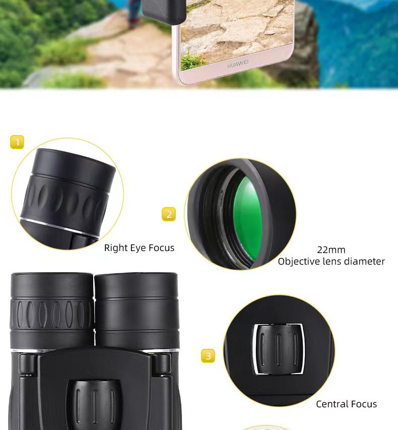 - ["High-Definition Telescope with 8x21 40x22 10x22 10x25 10x22 200x25 300x25 500x25 Magnification","15m Viewing Distance with 13.2m Field of View","Customized Design Available","50-100 Boxes Packaging","131M/1000M Viewing Distance"]