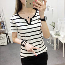 - ["Made of elastic fabric, comfortable and breathable","V-neck design, fashionable and stylish","Loose style, perfect for summer","Short sleeve, cool and refreshing","Striped pattern, classic and chic"]