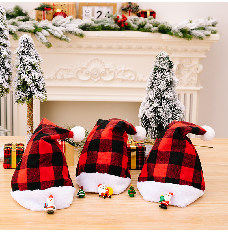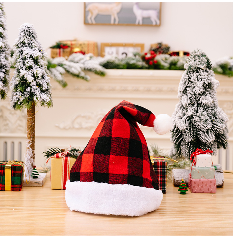 High-end Christmas Hat with Plush Edges Grid Pattern for Adults and Kids