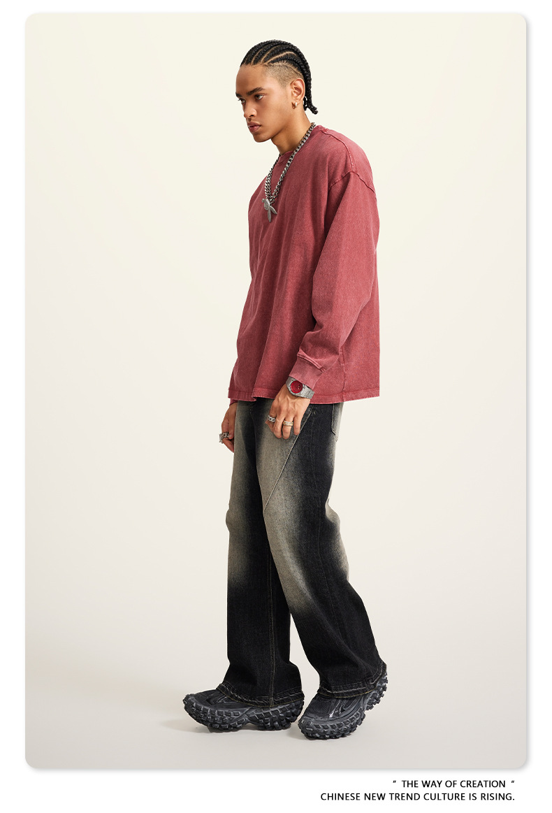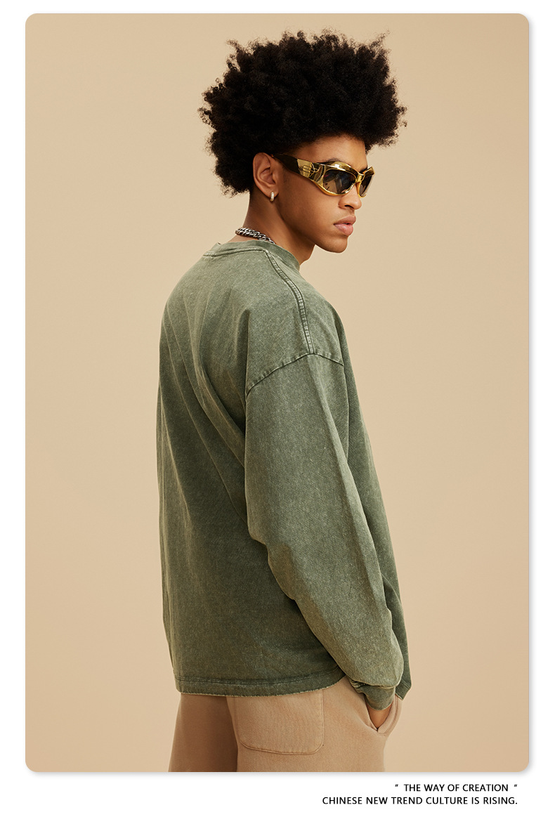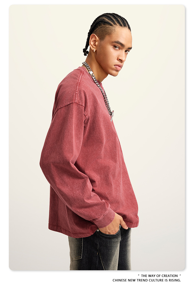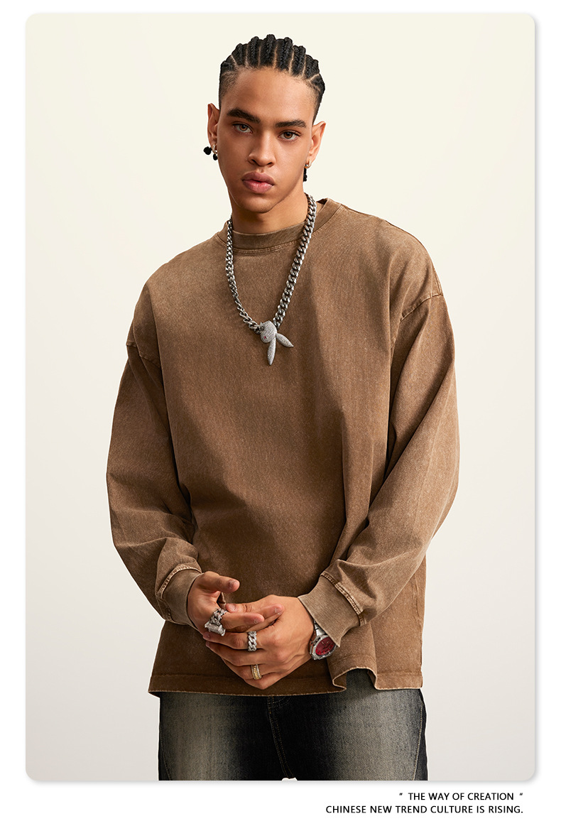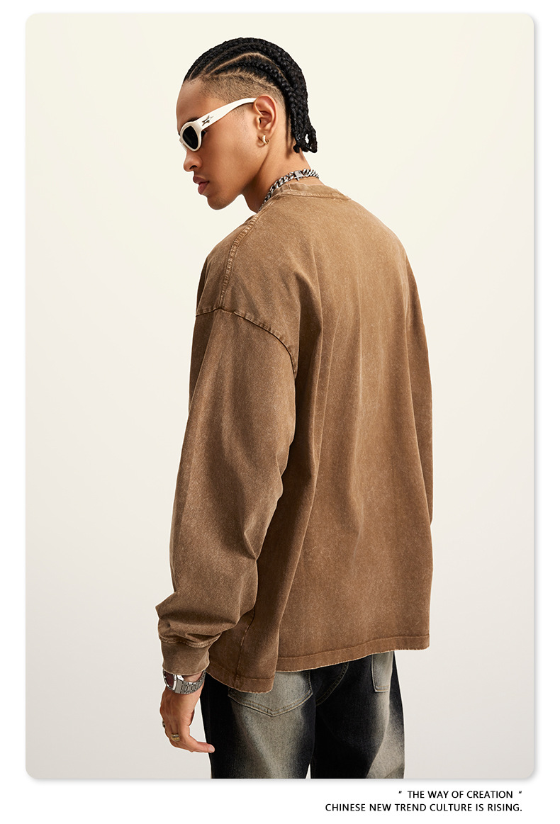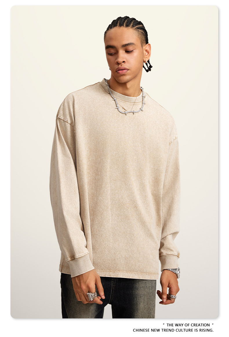 270G Retro Wash Long Sleeve T-Shirt for Men, American Style, Loose Fit, Youthful Style, Water Washed