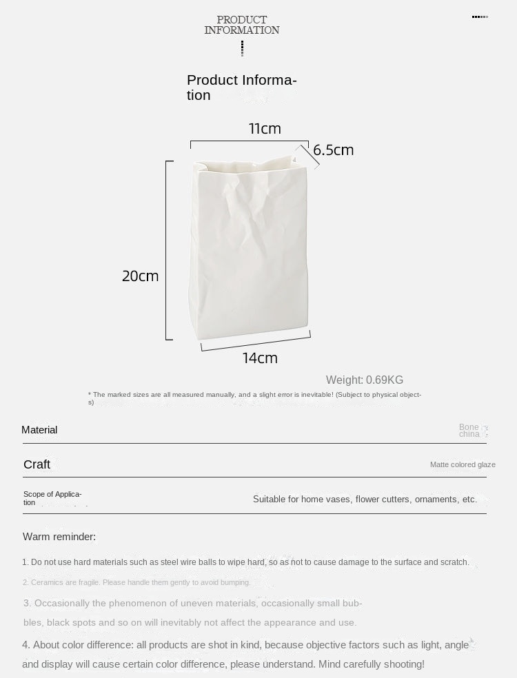 Modern Simple Luxury White Ceramic Folding Paper Bag Vase for Home Decoration