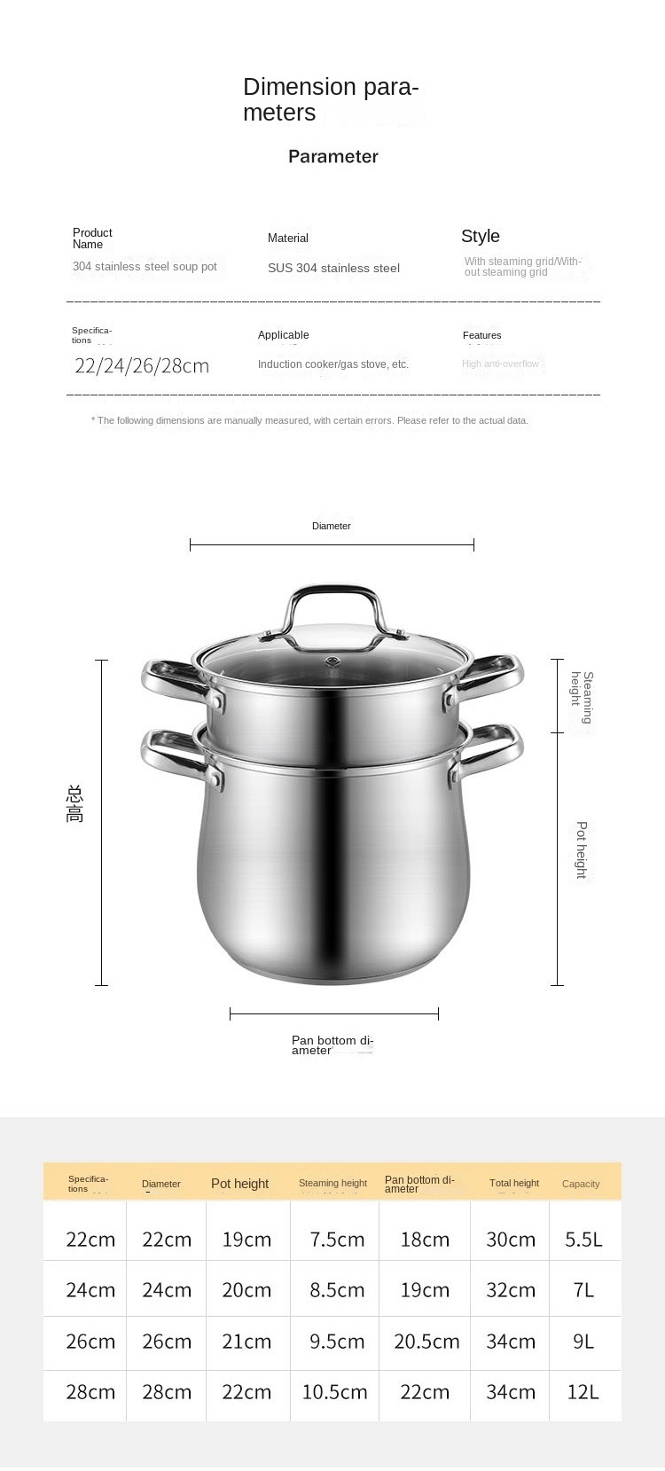 304 Stainless Steel Soup Pot with High Capacity and Anti-Overflow Steamer