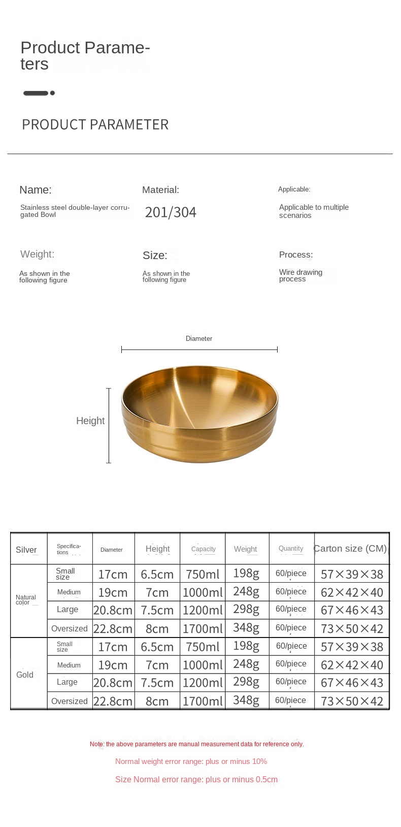 304 Stainless Steel Double Layer Bowl, Golden Color, Thickened, Suitable for Home and Commercial Use