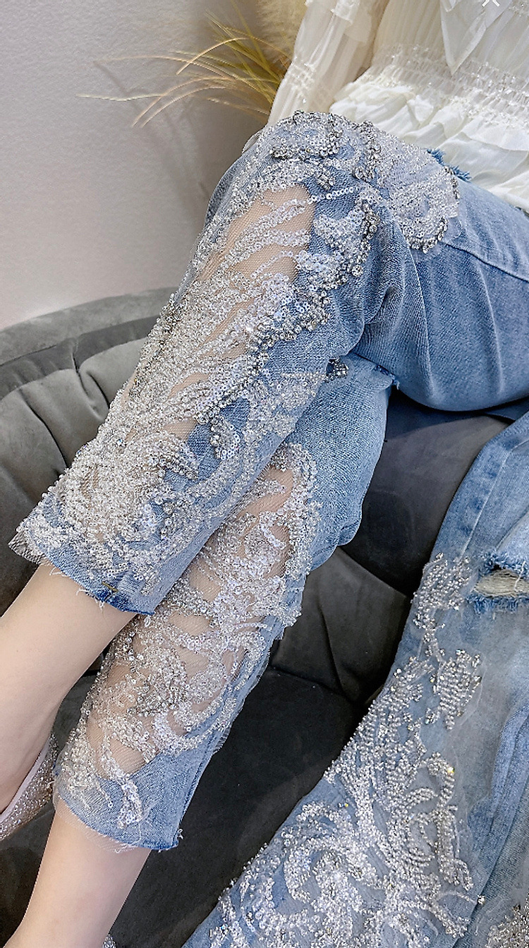 2025 Spring Summer High Waist Slim Fit Ripped Cropped Jeans with Heavy Gem Embellishments