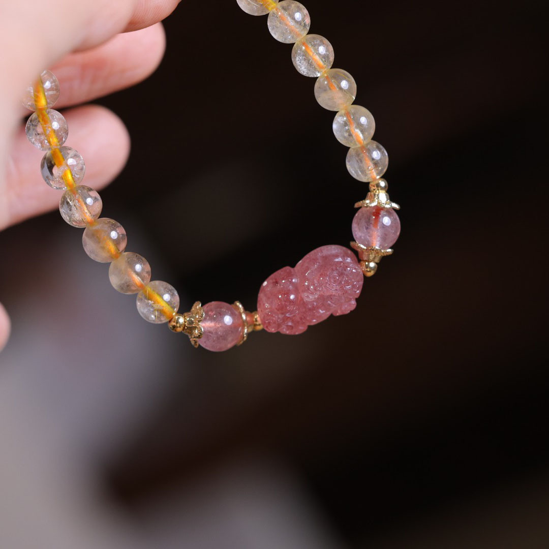 6MM Natural Gold Hair Crystal Bracelet for Women with Strawberry Crystal Pendant Jewelry Design Gift for Girlfriend