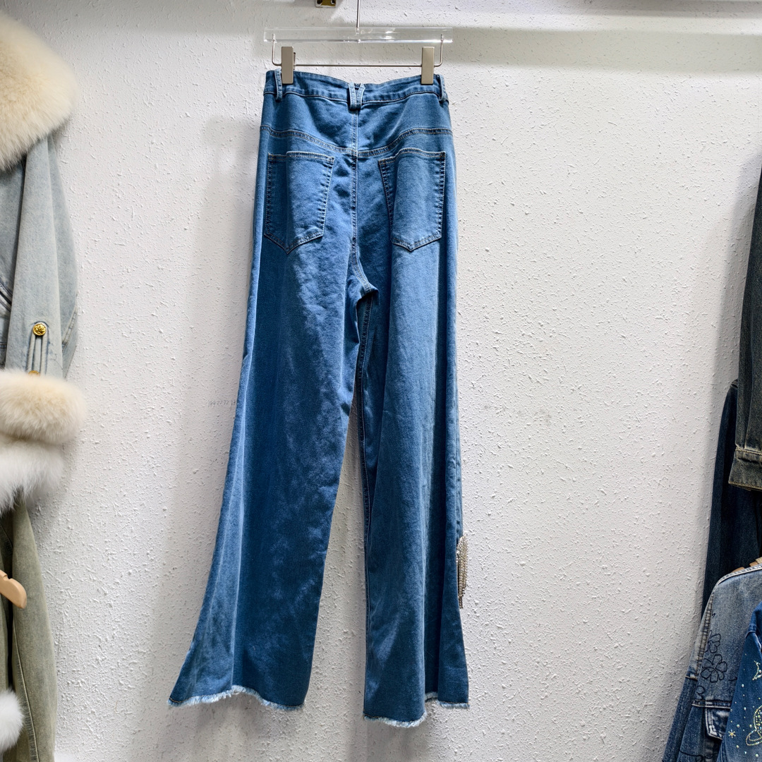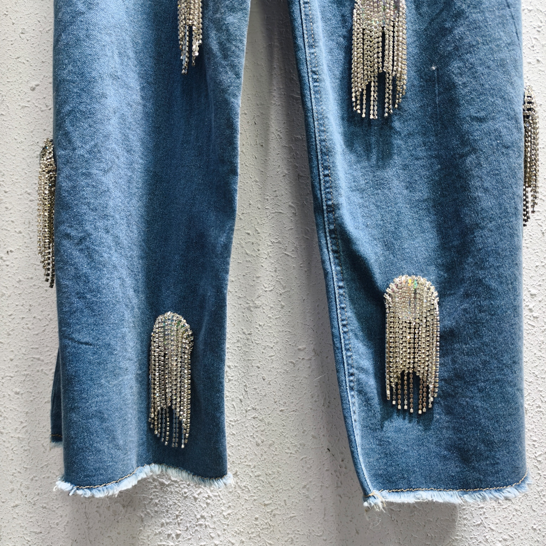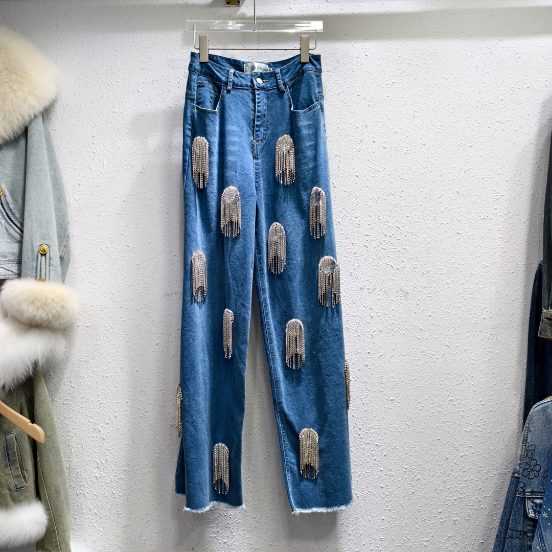 2024 Spring New Loose American Style Fringe Beaded Straight Leg Jeans