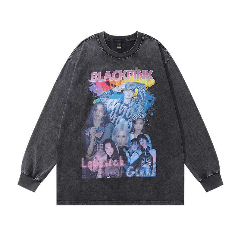 TKPA Vintage Printed Hip-hop Retro Washed Long Sleeve T-shirt for Men and Women