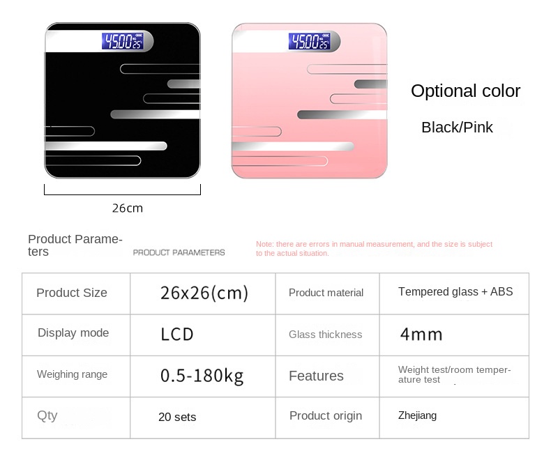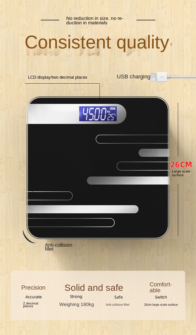 Smart Digital Body Weight Scale with 180kg Max Weight, 2*AAA/USB Power Supply, Steel-Tempered Glass Material