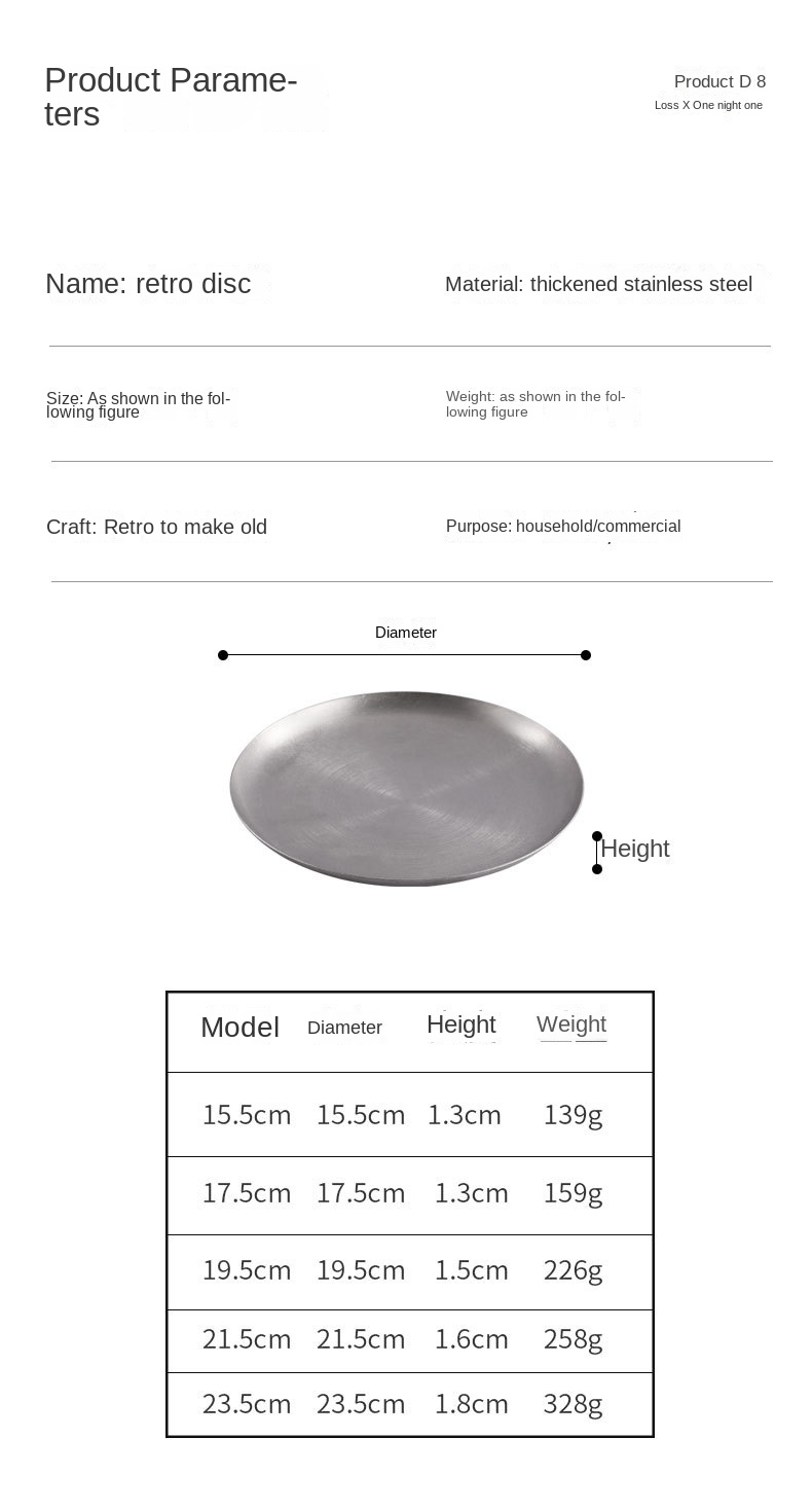 Vintage Stainless Steel Round Plate for Coffee Room, Dessert, Fruit, BBQ, Western Cuisine