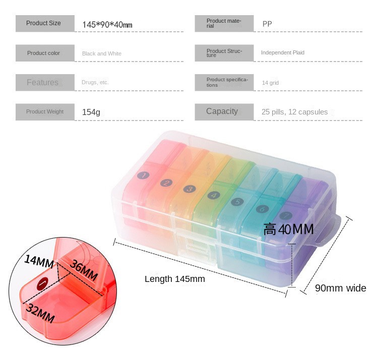 7-Day 14-Grid Pill Box Medicine Case with Dustproof Storage Box, Separable for a Week