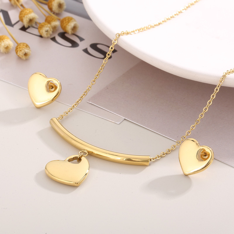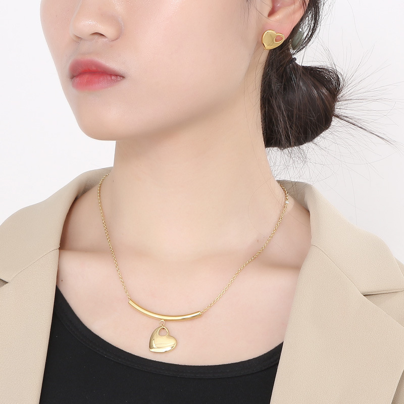 {"Style":"European and American","Pattern":"Heart/Droplet/Bell","Material":"Titanium Steel","Chain Style":"Choker Chain","Fashion Element":"Heart/Heart Shape","Set Combination":"Earring + Necklace","Applicable Crowd":"Female","Pendant Material":"Titanium Steel","Style Classification":"Fashionable Commuting","Processing Technology":"Electroplating","Fashion Element Category":"Shape/Pattern"}