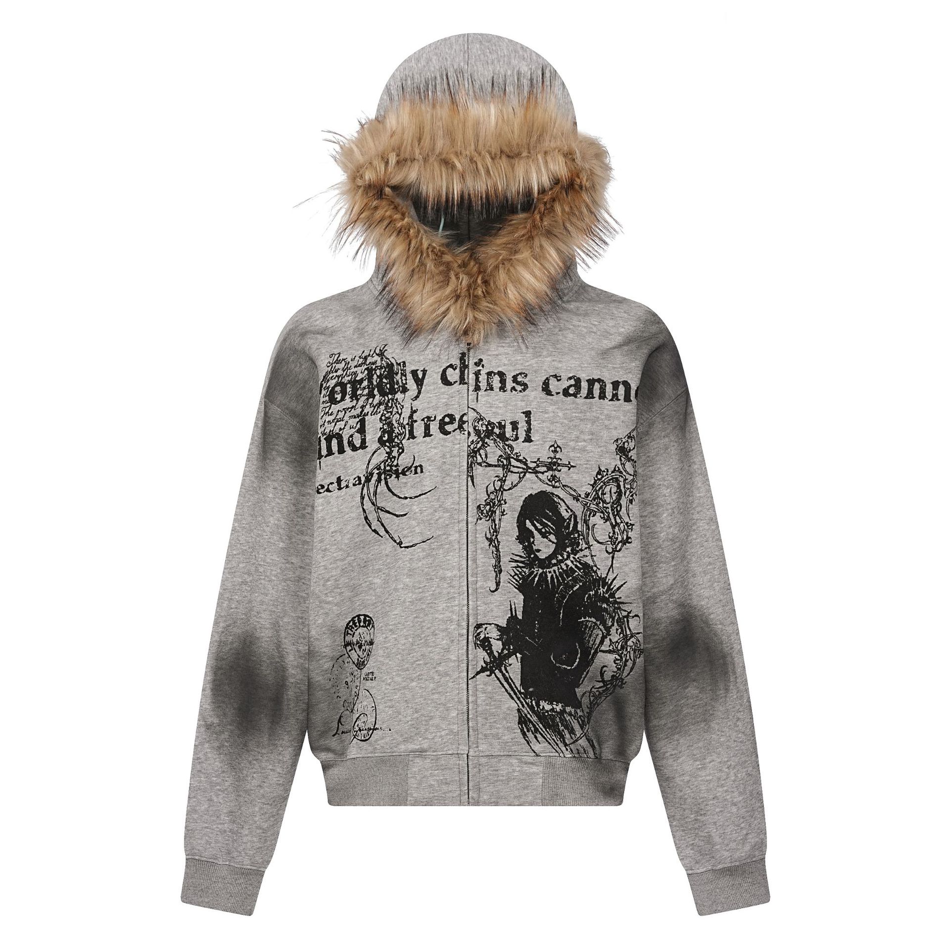 Jiayiku Men's 2024 New American Street Style Hoodie with Fur Collar, Vintage Dirty Wash, Zip Closure