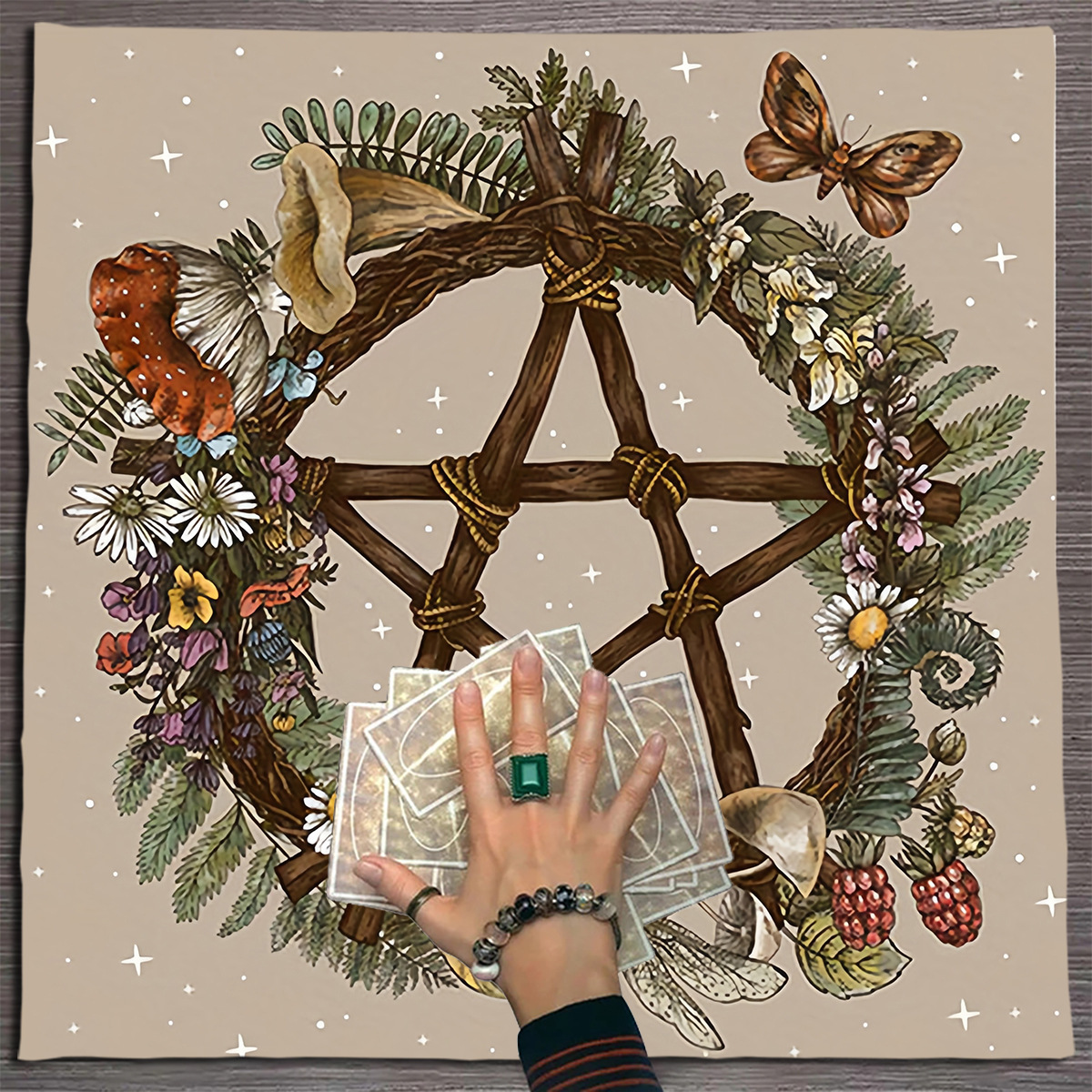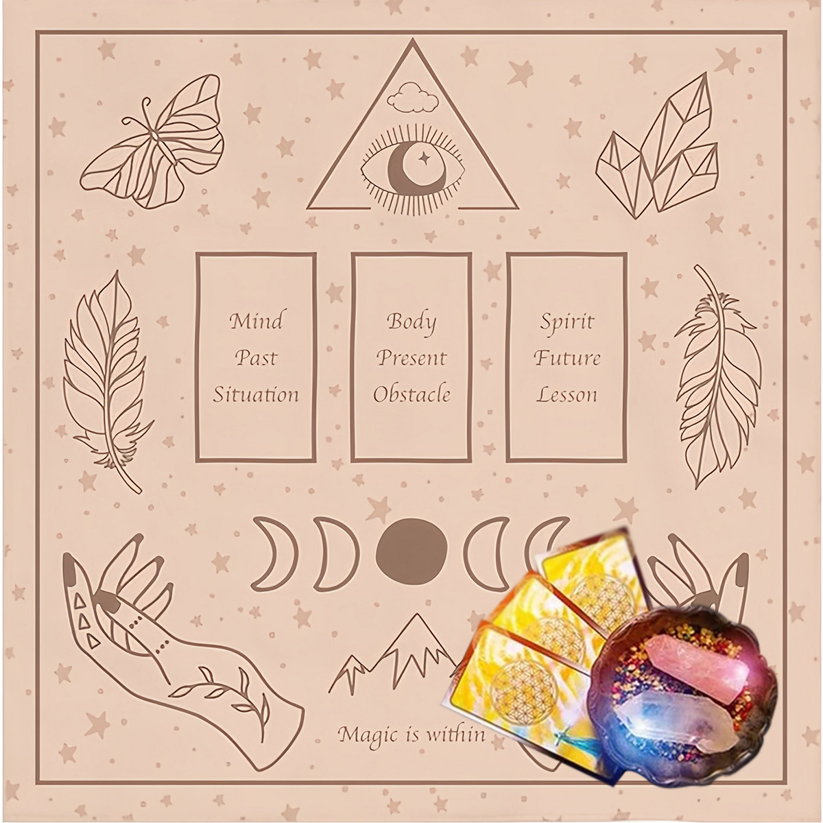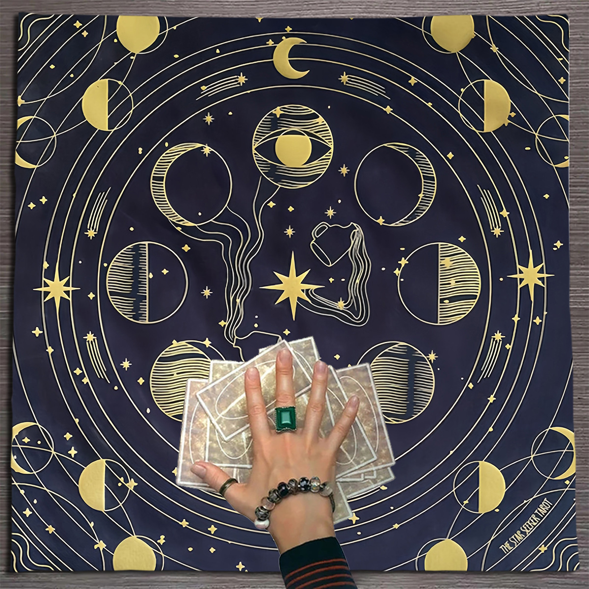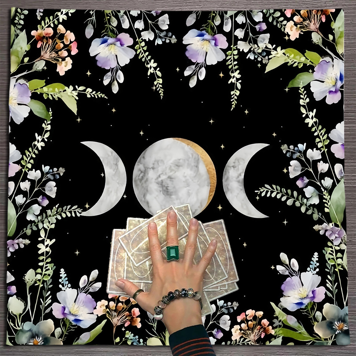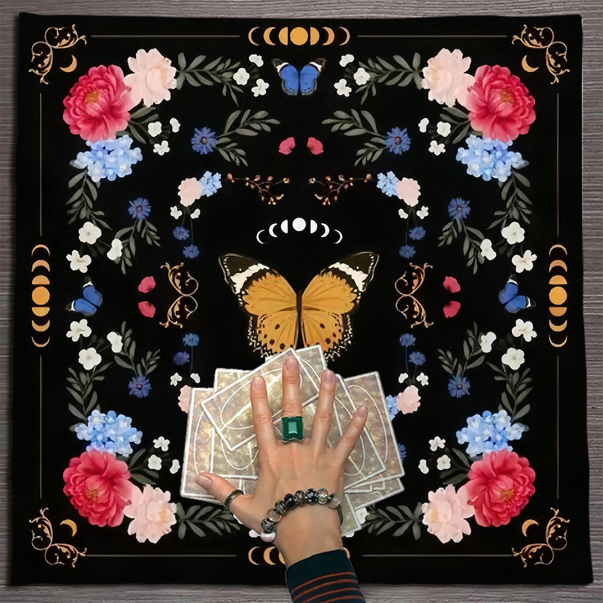 Tarot Tablecloth with Moon Phase Design, Butterfly, and Flower Print