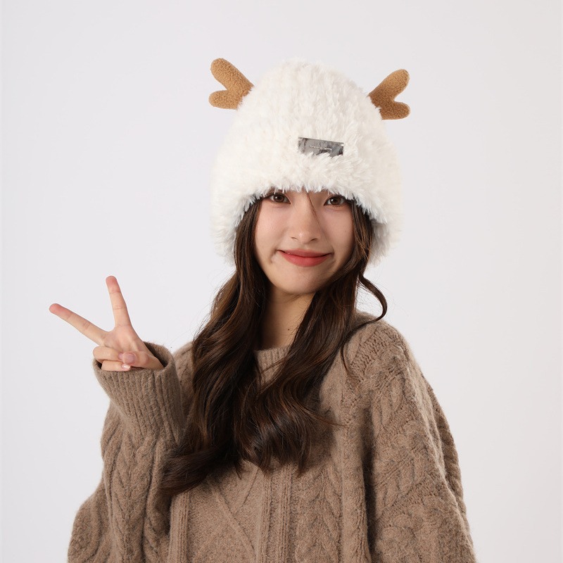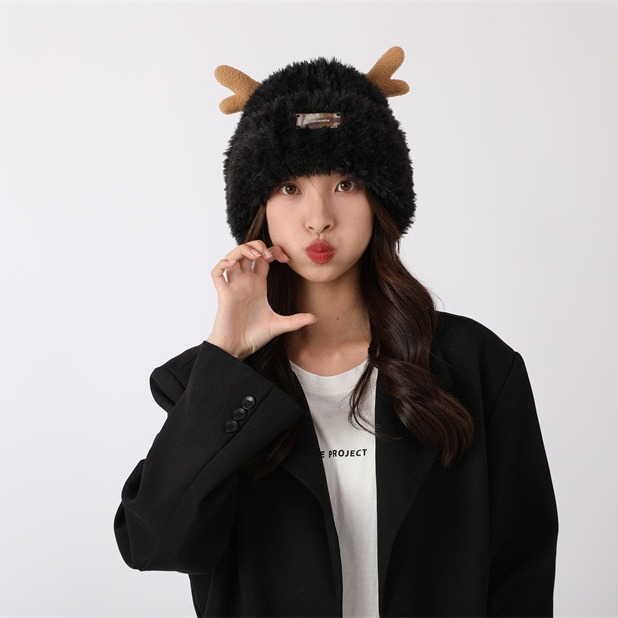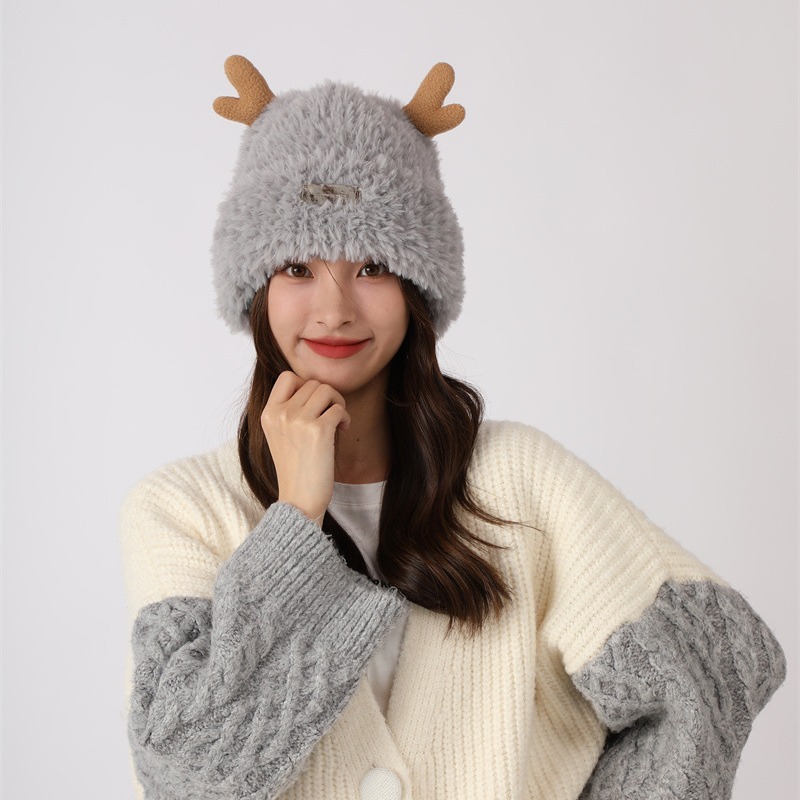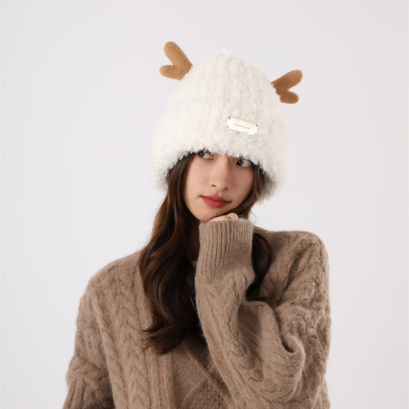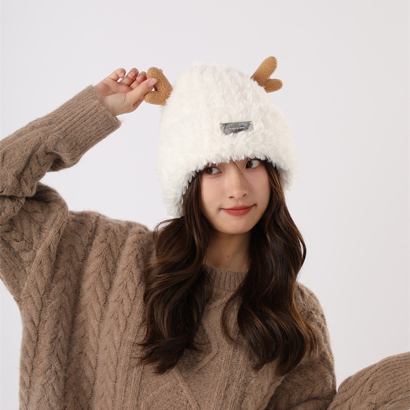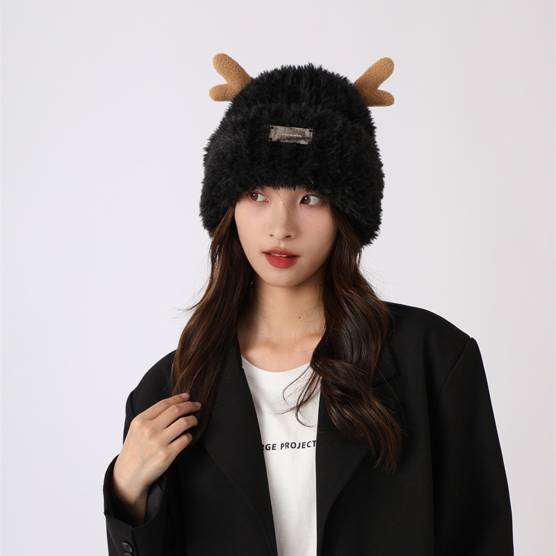 New Fashion Cute Knitted Winter Hat with Deer Horn Ear Design Outdoor Autumn and Winter Ladies Warm Hat with Pom Pom