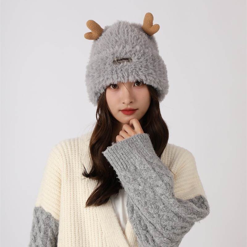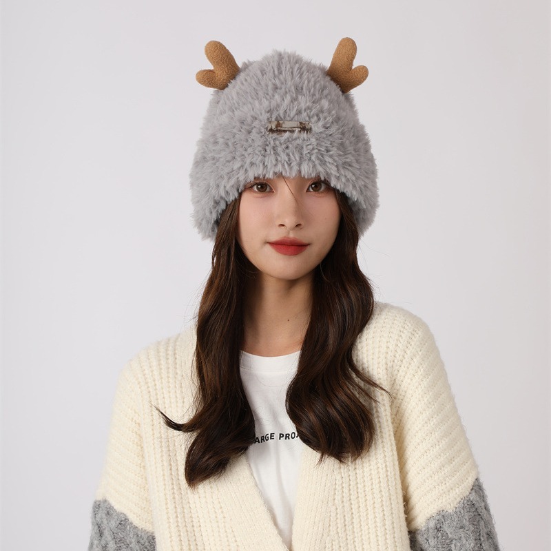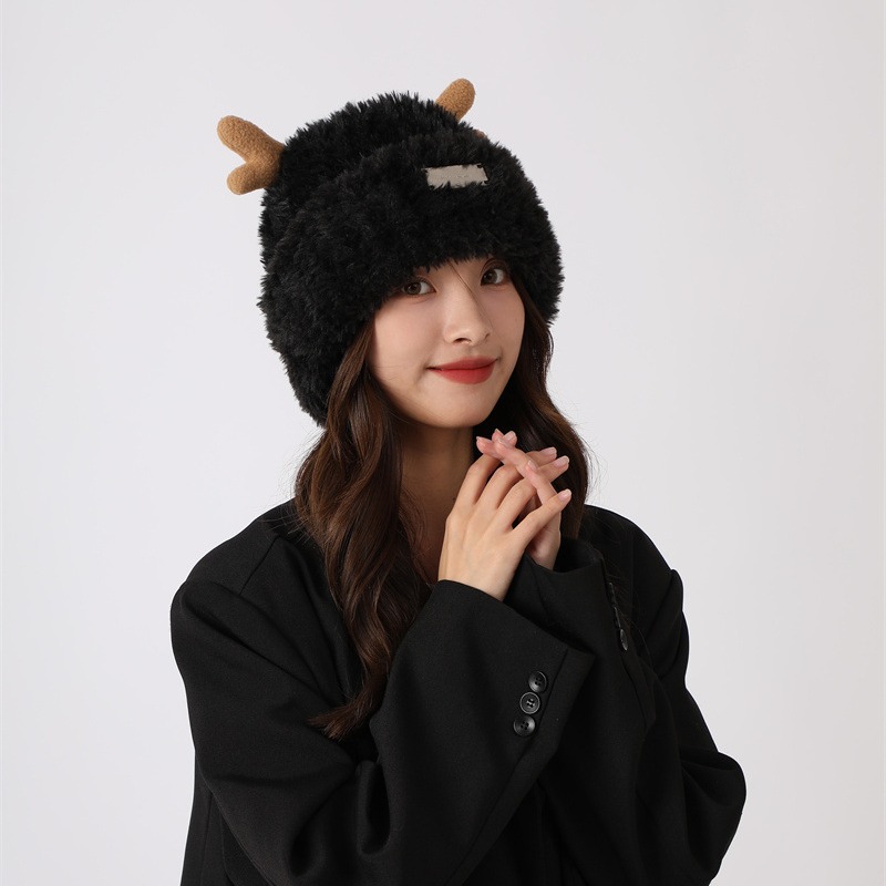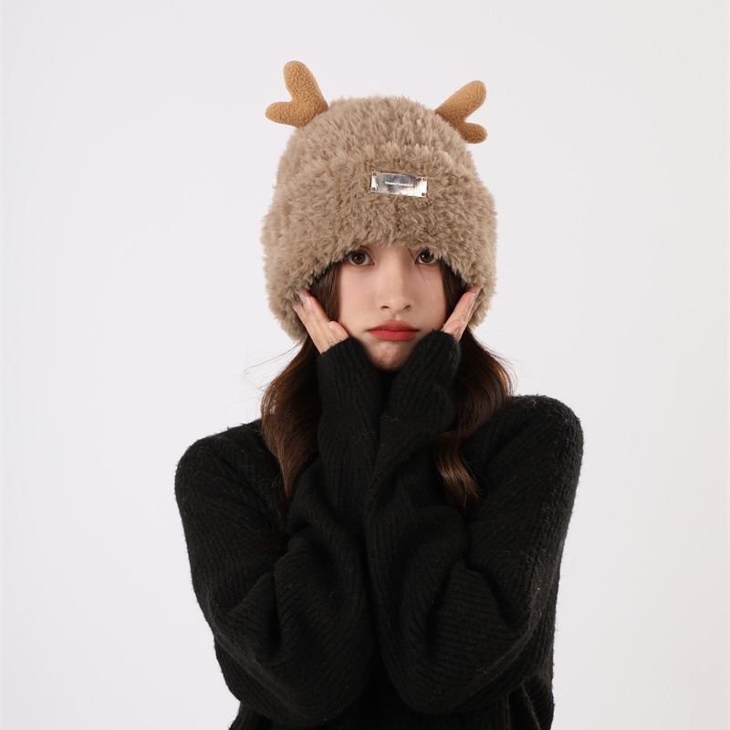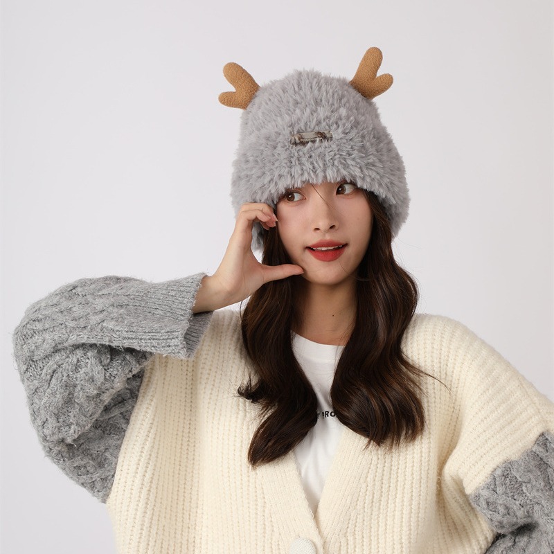 New Fashion Cute Knitted Winter Hat with Deer Horn Ear Design Outdoor Autumn and Winter Ladies Warm Hat with Pom Pom