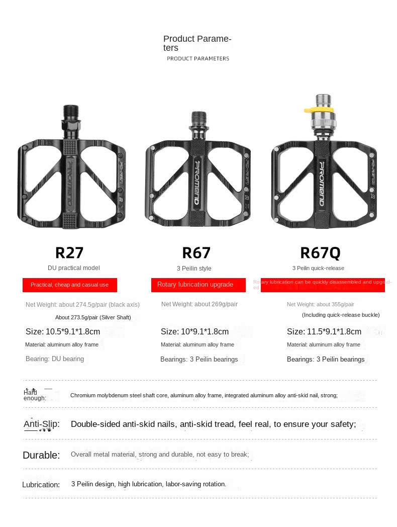 PROMEND Bicycle Pedal - PD-R27/R67/R67Q Alloy Bearing Pedal with Anti-Slip Quick Release