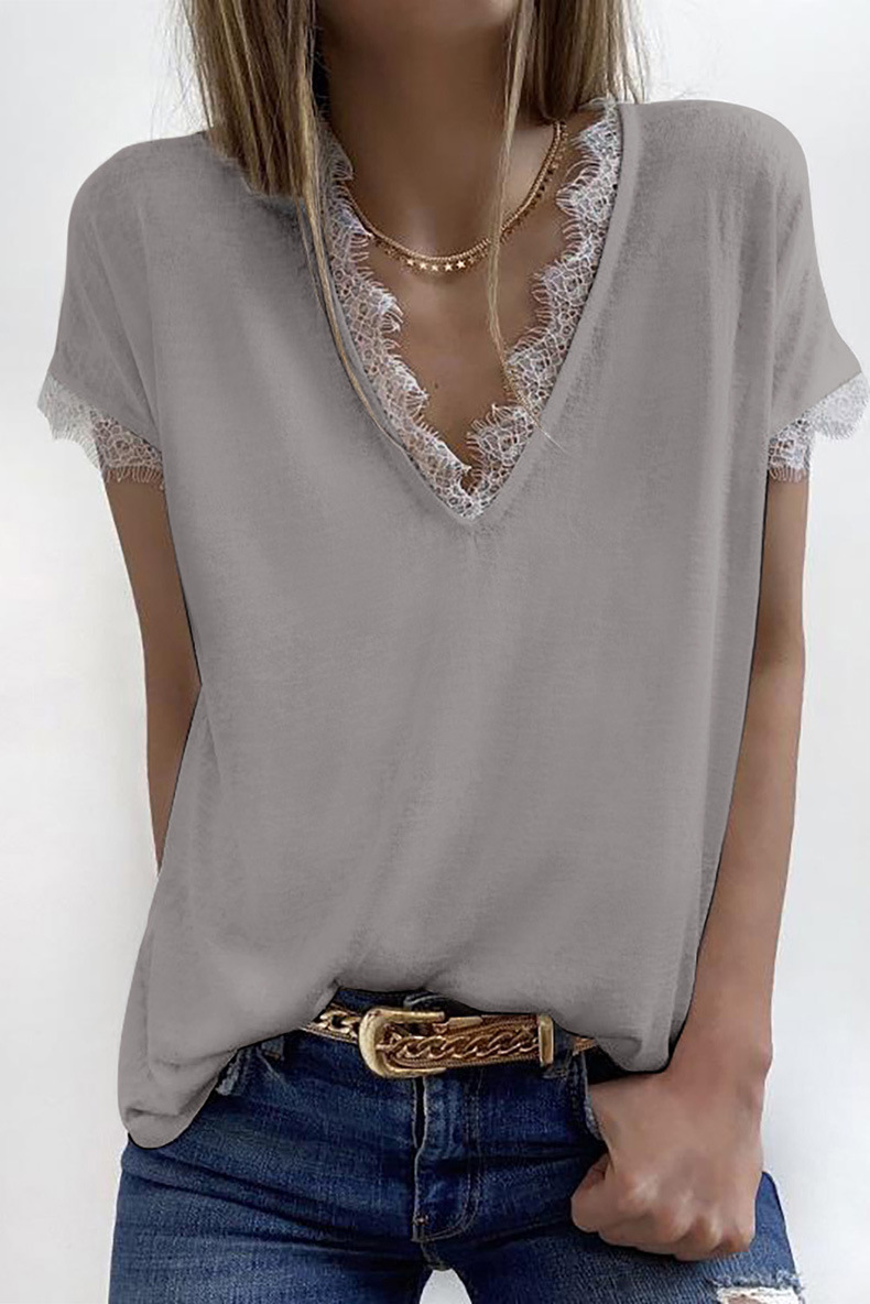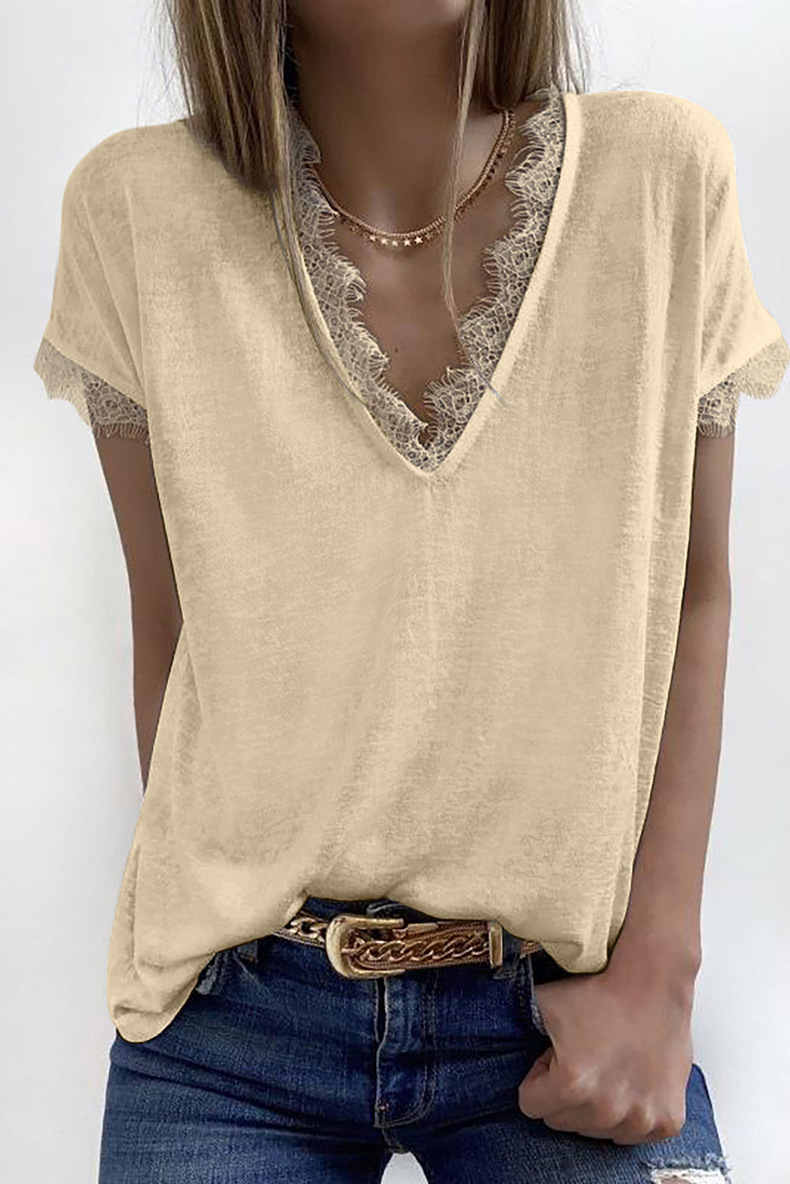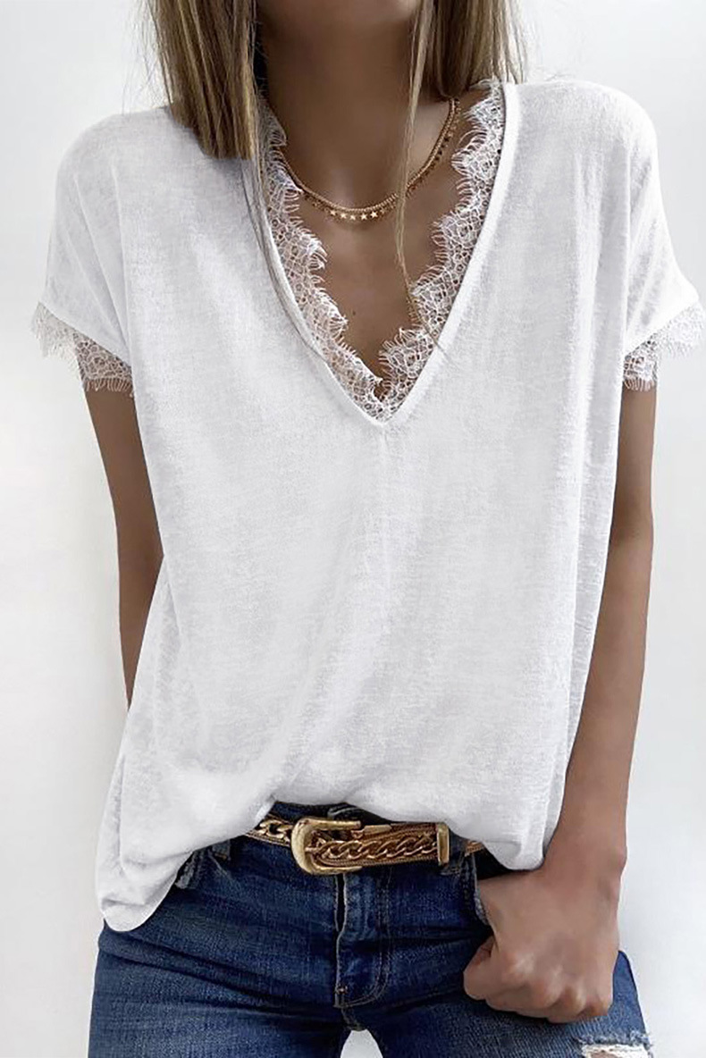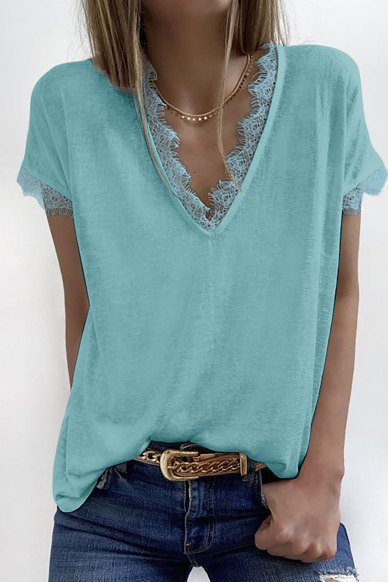 Women Summer V-Neck Lace Splicing Casual Short Sleeve T-Shirt Top