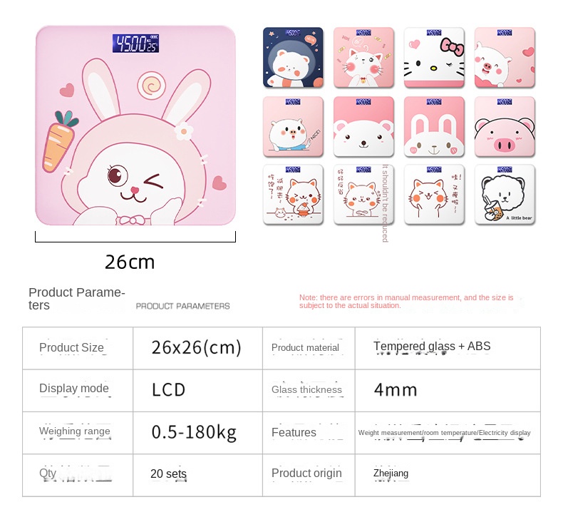 Smart Electronic Body Weight Scale with 180KG Max Capacity, 2*AAA/USB Rechargeable, Cartoon Design for Adults