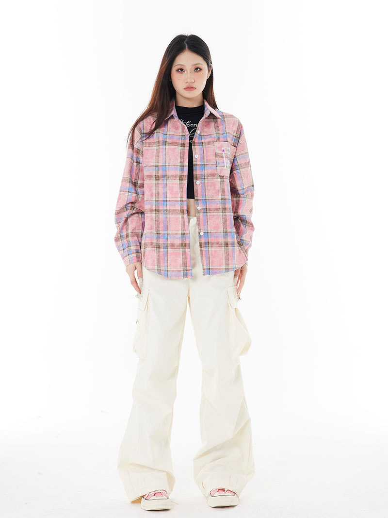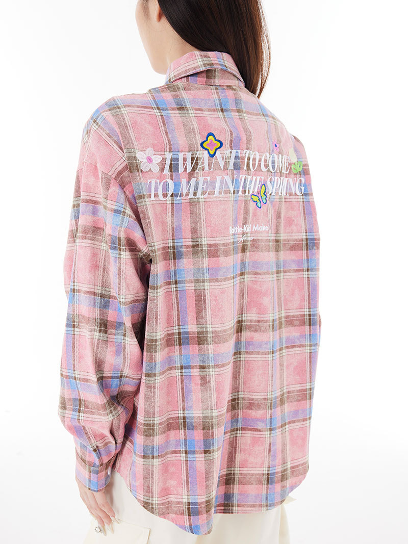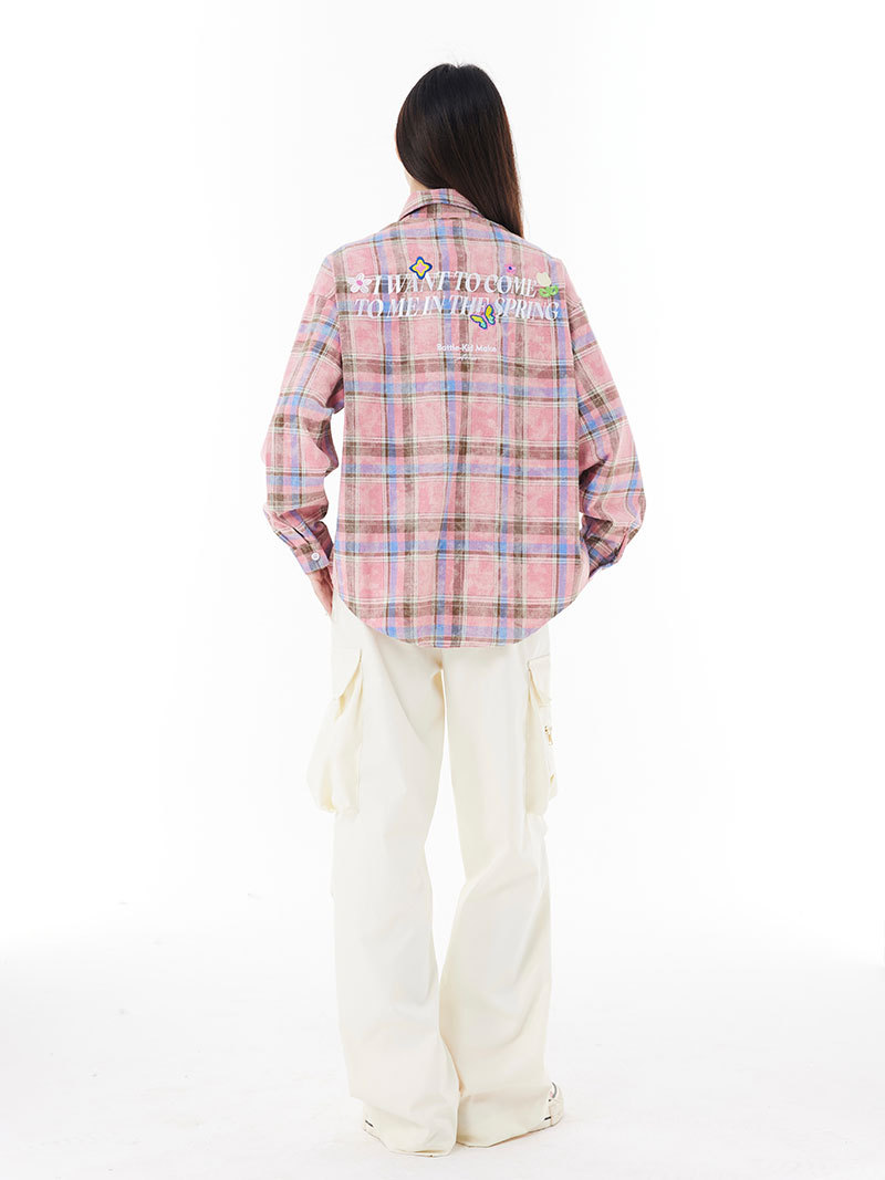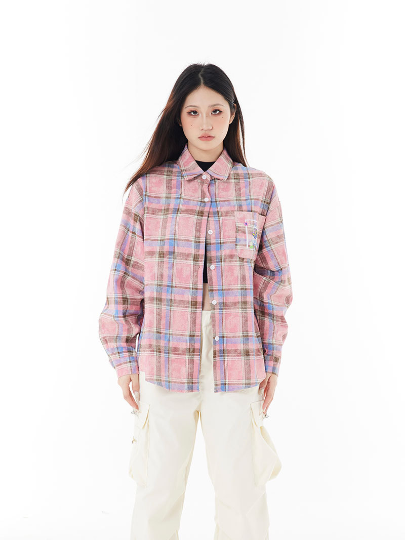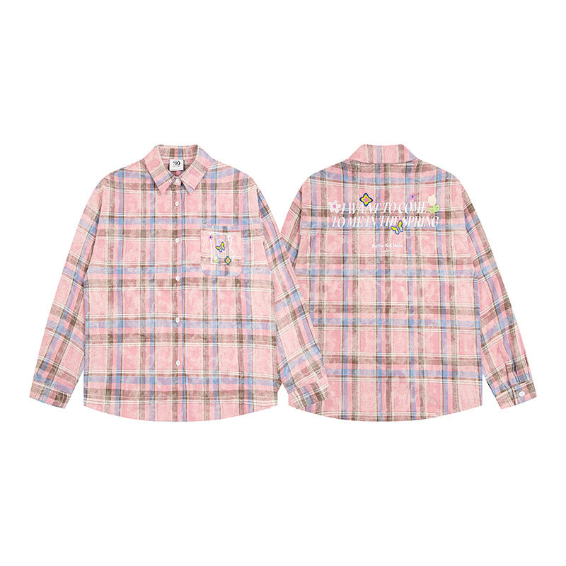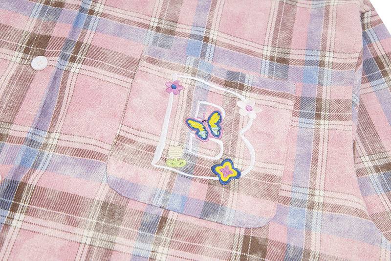 American High Street Neutral 2024 Autumn New Arrival Real Shot American Retro Embroidered Loose Plaid Long Sleeve Shirt Trend