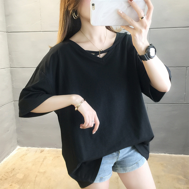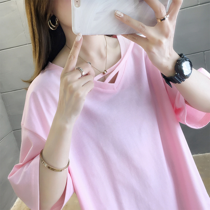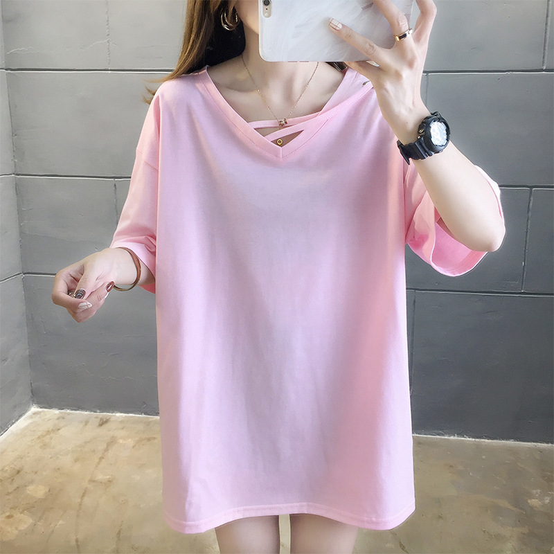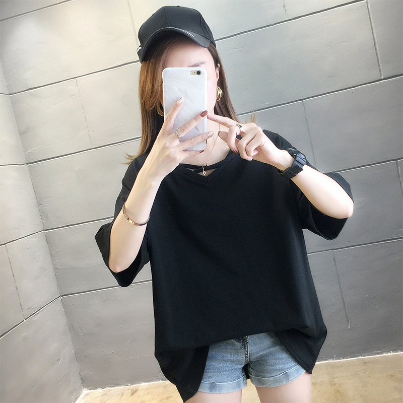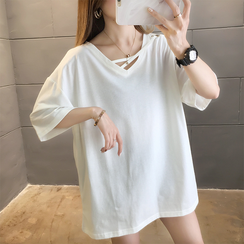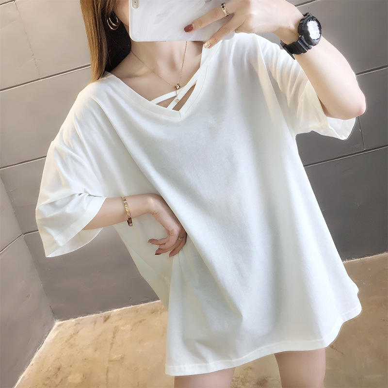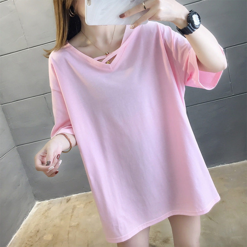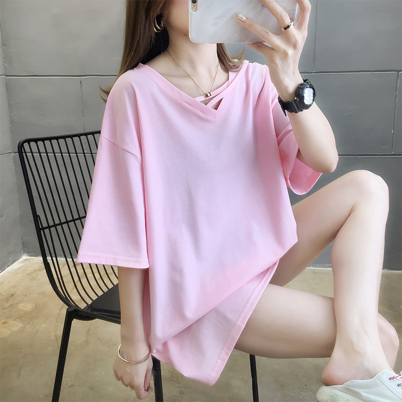 Women's Summer College Korean Style V-Neck Loose T-Shirt with Pure Color