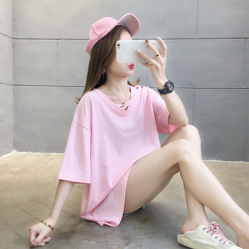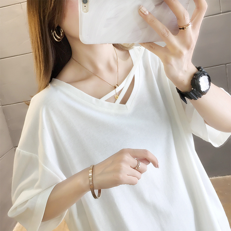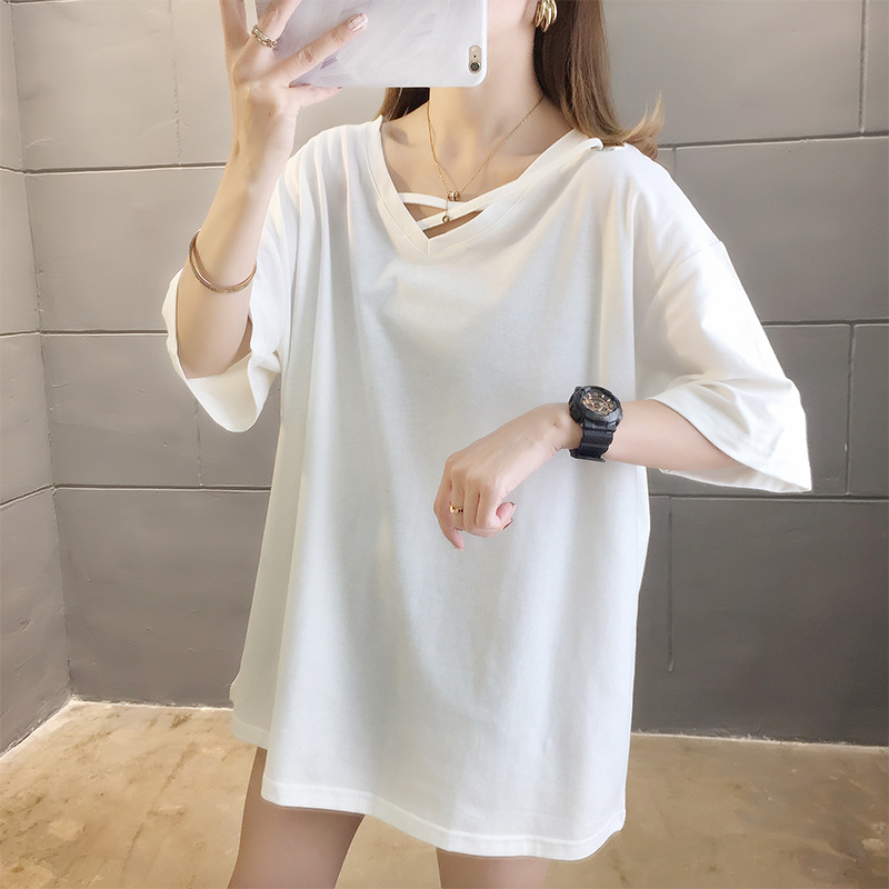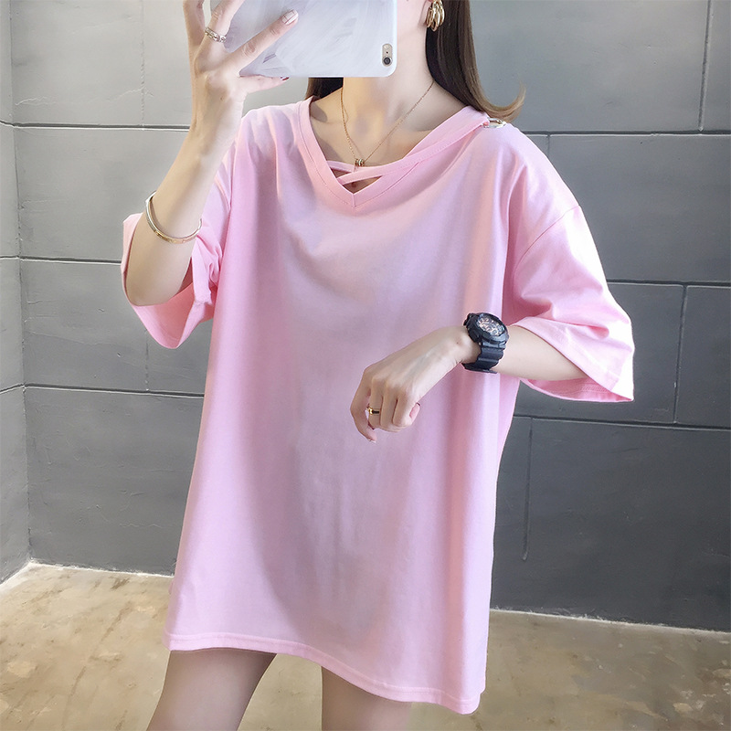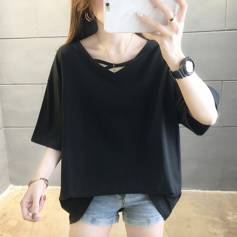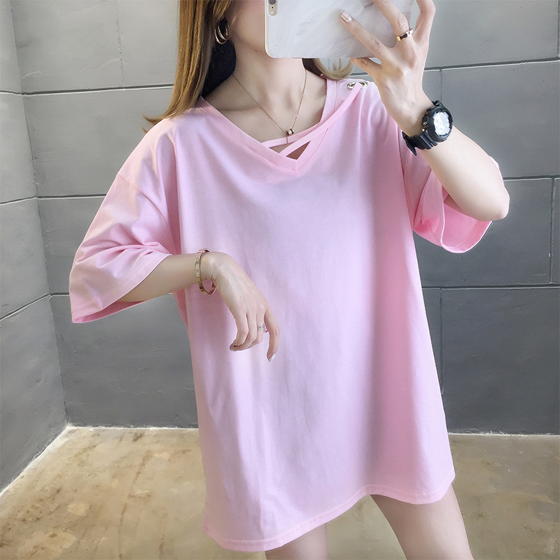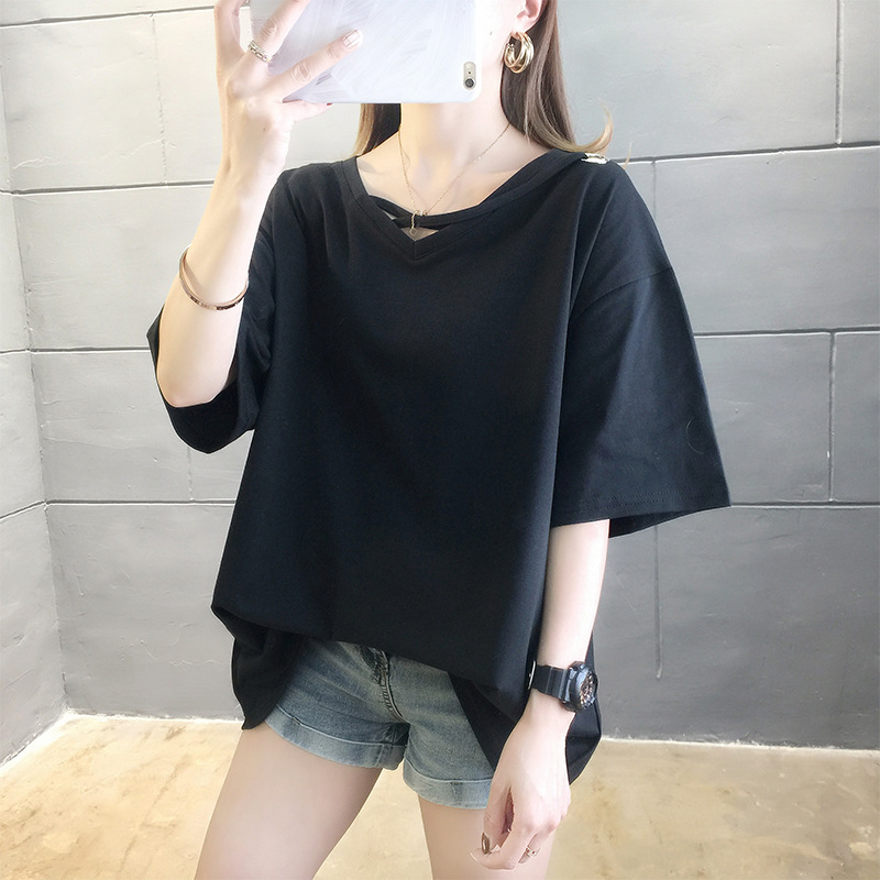 Women's Summer College Korean Style V-Neck Loose T-Shirt with Pure Color